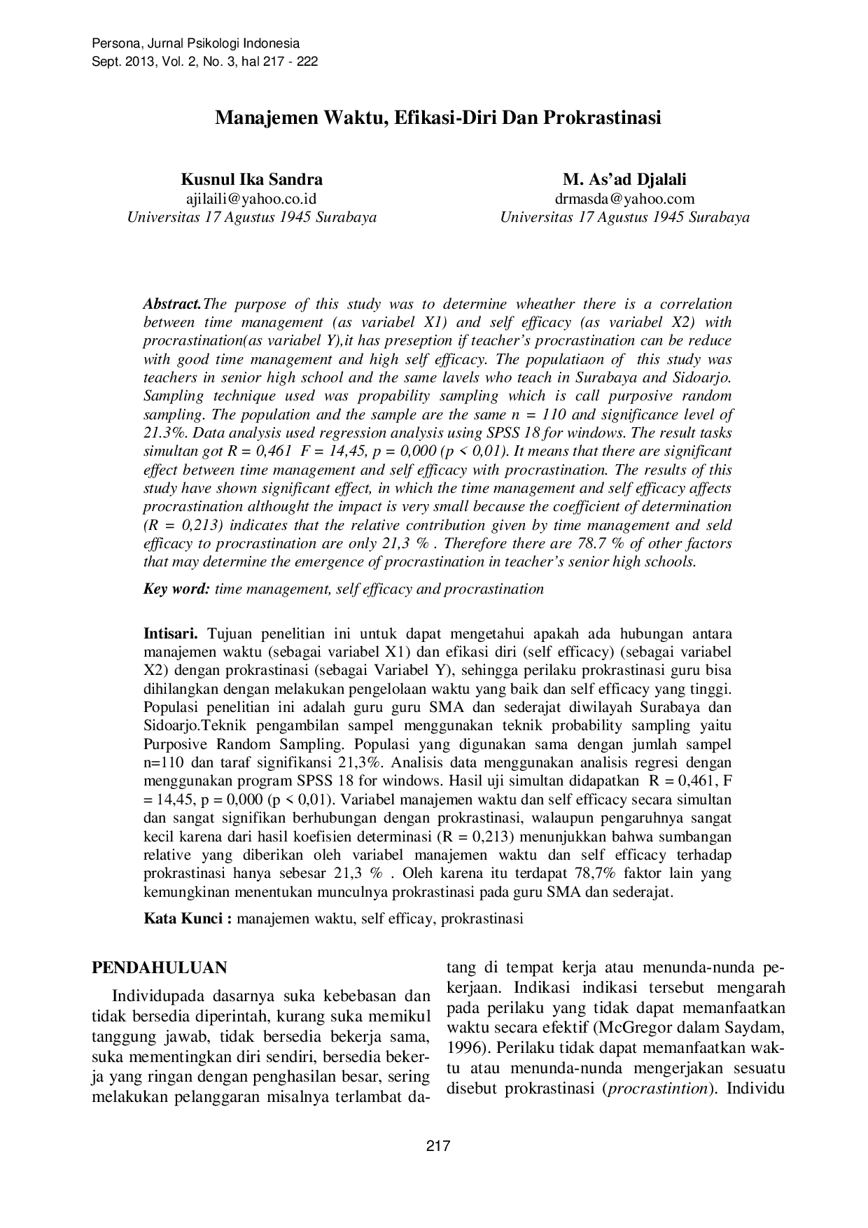 Persona:Jurnal Psikologi IndonesiaPersona:Jurnal Psikologi IndonesiaTujuan penelitian ini untuk dapat mengetahui apakah ada hubungan antara manajemen waktu (sebagai variabel X1) dan efikasi diri (self efficacy) (sebagai variabel X2) dengan prokrastinasi (sebagai Variabel Y), sehingga perilaku prokrastinasi guru bisa dihilangkan dengan melakukan pengelolaan waktu yang baik dan self efficacy yang tinggi. Populasi penelitian ini adalah guru guru SMA dan sederajat diwilayah Surabaya dan Sidoarjo.Teknik pengambilan sampel menggunakan teknik probability sampling yaitu Purposive Random Sampling. Populasi yang digunakan sama dengan jumlah sampel n=110 dan taraf signifikansi 21,3%. Analisis data menggunakan analisis regresi dengan menggunakan program SPSS 18 for windows. Hasil uji simultan didapatkan R = 0,461, F = 14,45, p = 0,000 (p < 0,01). Variabel manajemen waktu dan self efficacy secara simultan dan sangat signifikan berhubungan dengan prokrastinasi, walaupun pengaruhnya sangat kecil karena dari hasil koefisien determinasi (R = 0,213) menunjukkan bahwa sumbangan relative yang diberikan oleh variabel manajemen waktu dan self efficacy terhadap prokrastinasi hanya sebesar 21,3 % . Oleh karena itu terdapat 78,7% faktor lain yang kemungkinan menentukan munculnya prokrastinasi pada guru SMA dan sederajat.