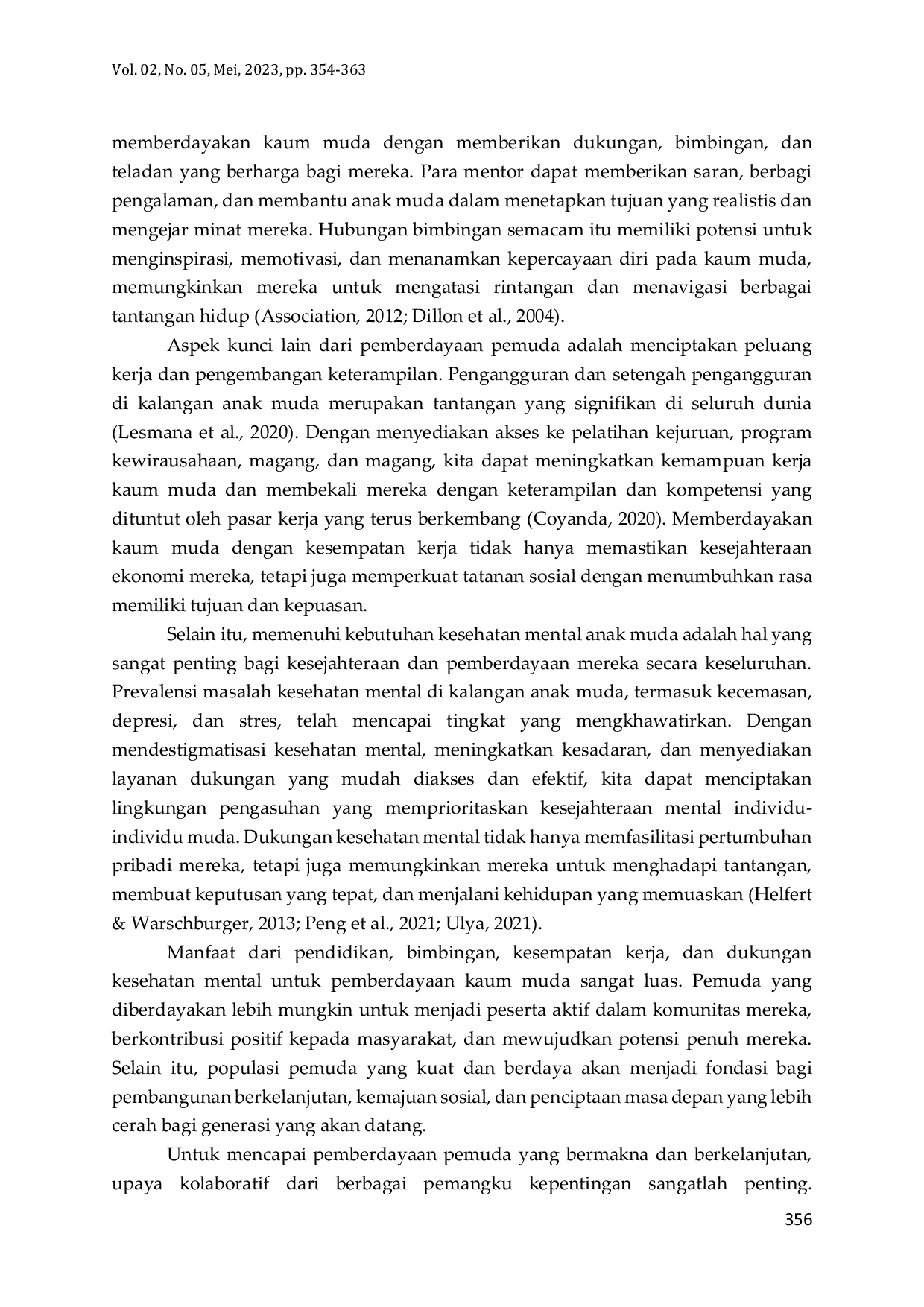 Memberdayakan kaum muda melalui pendidikan, bimbingan, kesempatan kerja, dan dukungan kesehatan mental sangat penting bagi perkembangan mereka serta kemakmuran masyarakat.Tantangan utama meliputi akses terbatas ke pendidikan berkualitas, program bimbingan yang tidak memadai, tingkat pengangguran tinggi, dan layanan kesehatan mental yang kurang.Pendekatan komprehensif dan terintegrasi yang melibatkan pemerintah, lembaga pendidikan, bisnis, masyarakat, serta pemuda sendiri, termasuk reformasi kebijakan, investasi infrastruktur, program bimbingan, pelatihan kejuruan, kampanye kesadaran kesehatan mental, dan kolaborasi pemangku kepentingan, diperlukan untuk mengatasi hambatan tersebut.
