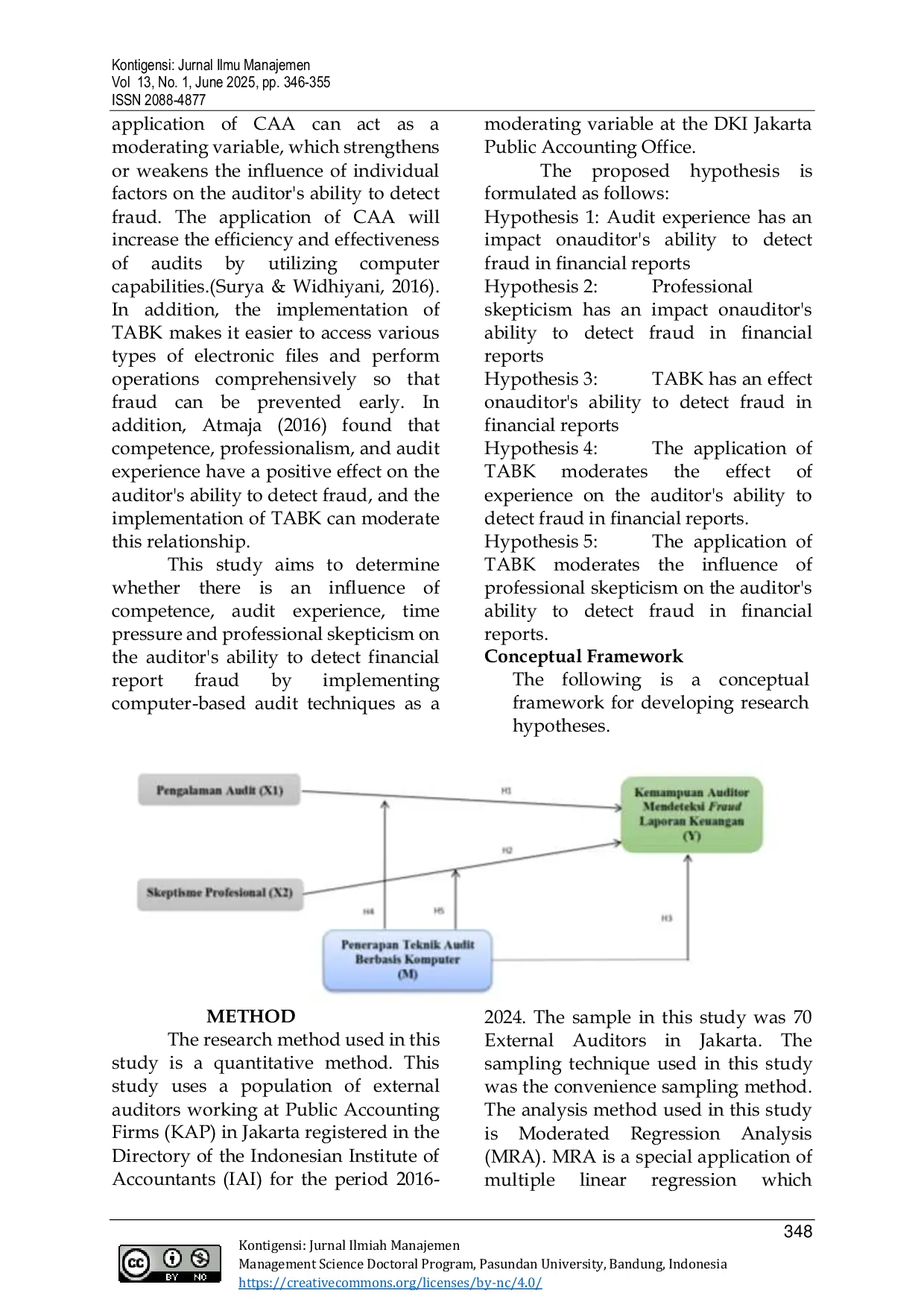 Kontigensi : Jurnal Ilmiah ManajemenKontigensi : Jurnal Ilmiah ManajemenPenelitian ini bertujuan untuk menganalisis pengaruh pengalaman audit dan skeptisisme profesional terhadap kemampuan auditor dalam mendeteksi kecurangan laporan keuangan, dengan penerapan Teknik Audit Berbantuan Komputer (CAATs) sebagai variabel moderasi. Pendekatan kuantitatif digunakan, dengan data dikumpulkan melalui kuesioner yang disebarkan kepada 65 auditor eksternal yang bekerja di Kantor Akuntan Publik di wilayah Jakarta. Metode analisis yang digunakan adalah Moderated Regression Analysis (MRA). Hasil penelitian menunjukkan bahwa pengalaman audit tidak memiliki pengaruh signifikan terhadap kemampuan auditor dalam mendeteksi kecurangan, sementara skeptisisme profesional memiliki pengaruh positif. Penerapan CAATs secara langsung juga tidak secara signifikan memengaruhi kemampuan deteksi; namun, CAATs mampu memoderasi hubungan antara skeptisisme profesional dan kemampuan auditor dalam mendeteksi kecurangan. Sebaliknya, CAATs tidak memoderasi hubungan antara pengalaman audit dan kemampuan deteksi kecurangan. Temuan ini menyoroti pentingnya skeptisisme profesional dan pemanfaatan teknologi dalam meningkatkan efektivitas auditor dalam deteksi kecurangan.