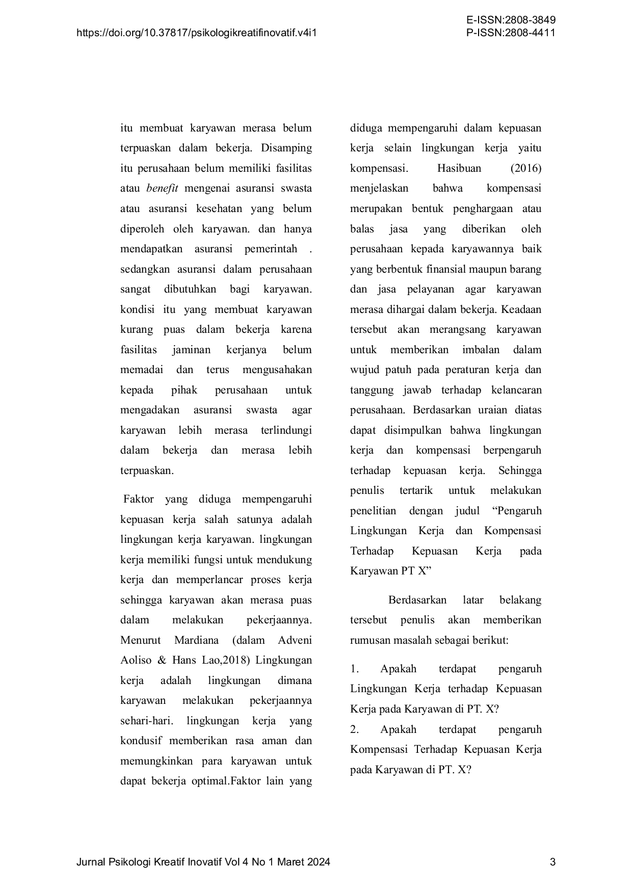 Psikologi Kreatif InovatifPsikologi Kreatif InovatifTujuan dari penelitian ini adalah untuk mengetahui pengaruh lingkungan kerja dan kompensasi terhadap kepuasan kerja pada karyawan PT. X Penelitian ini merupakan penelitian kuantitatif. Sampel penelitian ini berjumlah 50 Karyawan. Teknik pengambilan sampel dilakukan dengan metode sensus sampling karakteristik : karyawan yang aktif bekerja di PT.X. Hasil penelitian menunjukkan bahwa terdapat pengaruh yang signifikan dengan arah positif antara lingkungan kerja terhadap kepuasan kerja sebesar R = 0,604, R2 = 0, 0,365 dengan p = 0,001 dan terdapat pengaruh yang signifikan dengan arah positif antara kompensasi terhadap kepuasan kerja sebesar R = 0,522, R2 = 0,273 dengan p = .0,001 Selanjutnya, hasil analisis data dengan regresi linear berganda menggunakan SPSS 29.0 for Windows diperoleh koefisien determinasi R Square sebesar 0,389 dan berdasarkan hasil analisis menggunakan metode regresi linear berganda juga diperoleh nilai koefisien korelasi R = 0,623 dan p = 0,001 yang berarti terdapat pengaruh antara lingkungan kerja dan kompensasi terhadap kepuasan kerja pada karyawan PT. X.