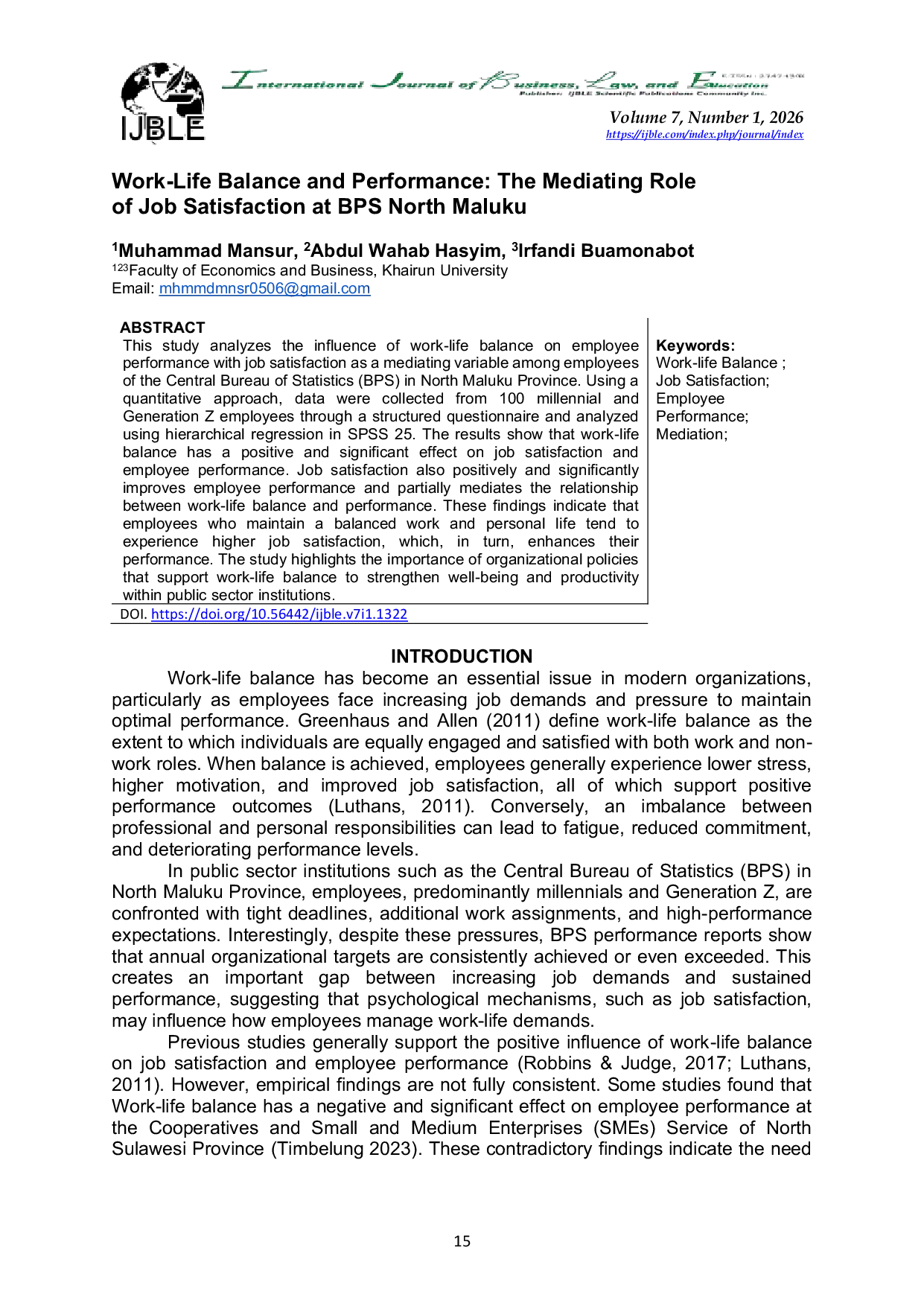 - Work-Life Balance and Performance: The Mediating Role of Job Satisfaction at BPS North Maluku | International... doi.org/10.56442/ijble.v7i1.1322Work Life Balance and Performance The Mediating Role of Job Satisfaction at BPS North Maluku International doi 10 56442 ijble v7i1 1322