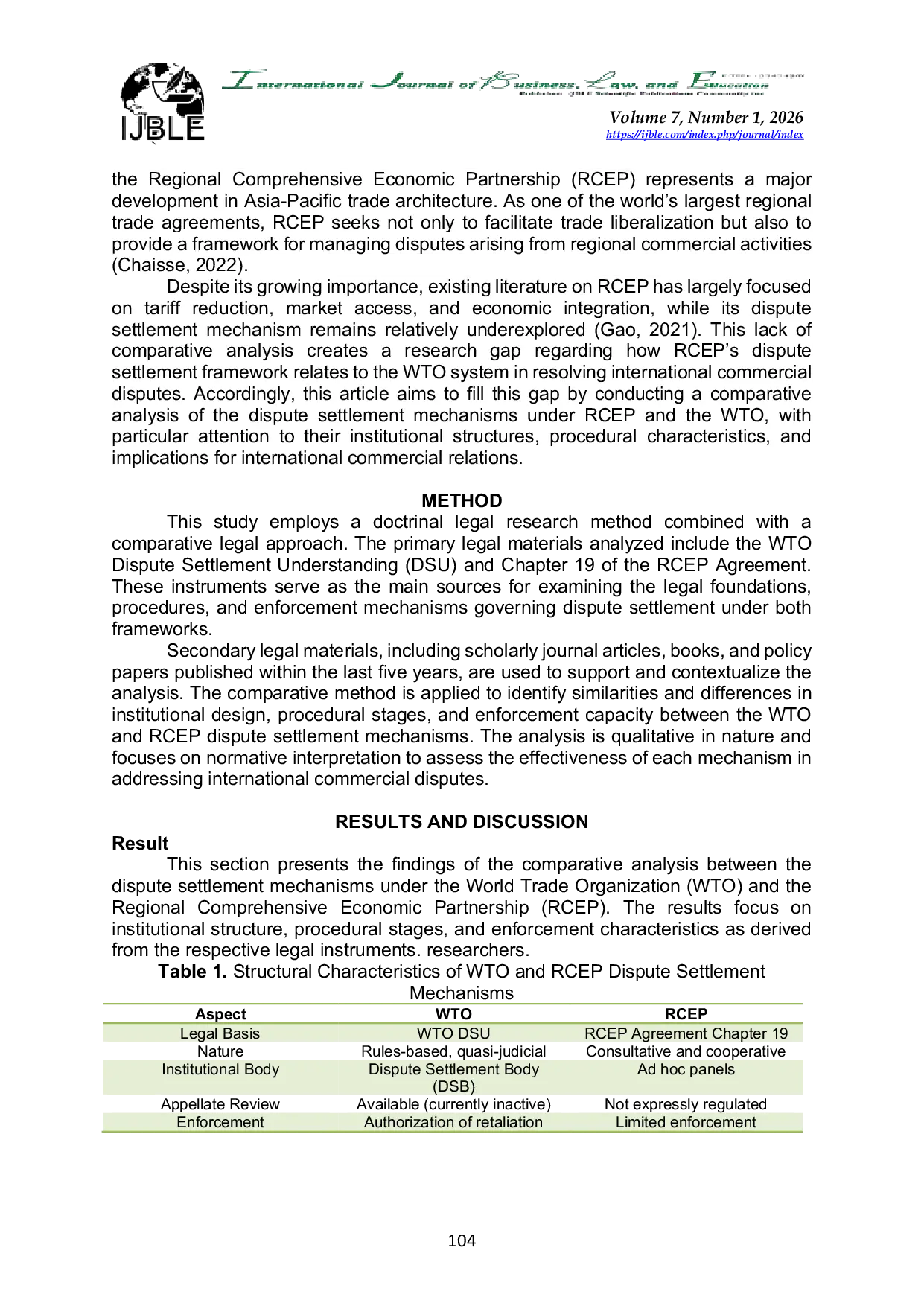 International Journal of Business, Law, and EducationInternational Journal of Business, Law, and EducationThis article examines the dispute settlement mechanisms under the Regional Comprehensive Economic Partnership (RCEP) and the World Trade Organization (WTO) through a comparative legal analysis. The study aims to assess how both frameworks regulate international commercial disputes and promote legal certainty in cross-border trade relations. Employing a doctrinal and comparative legal approach, this research analyzes treaty provisions, institutional structures, procedural stages, and enforcement mechanisms governing dispute resolution under RCEP and the WTO Dispute Settlement Understanding. The findings indicate that while the WTO provides a more institutionalized and legally binding mechanism, RCEP emphasizes flexibility, consultation, and regional consensus. This article argues that RCEPs dispute settlement mechanism may complement the WTO framework by offering an alternative forum for resolving international commercial disputes, particularly within the Asia-Pacific region.