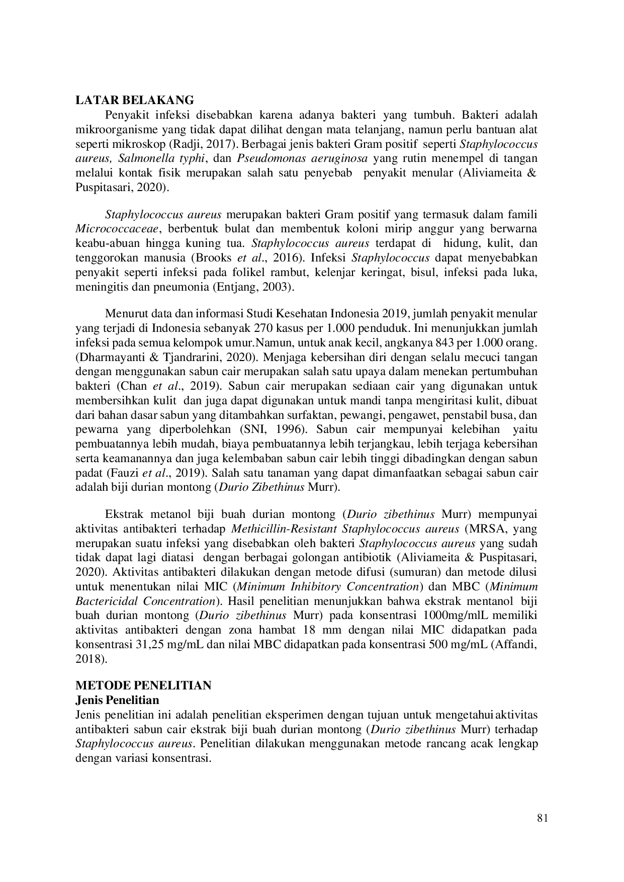 Penelitian ini menyimpulkan bahwa ekstrak biji durian montong memiliki efek antibakteri terhadap Staphylococcus aureus secara in vitro.Kandungan senyawa aktif seperti flavonoid, tanin, dan saponin dalam biji durian montong berperan dalam menghambat pertumbuhan bakteri tersebut.Peningkatan konsentrasi ekstrak dalam formulasi sabun cair berkorelasi dengan peningkatan luas zona hambat, menunjukkan efektivitas antibakteri yang lebih tinggi.
