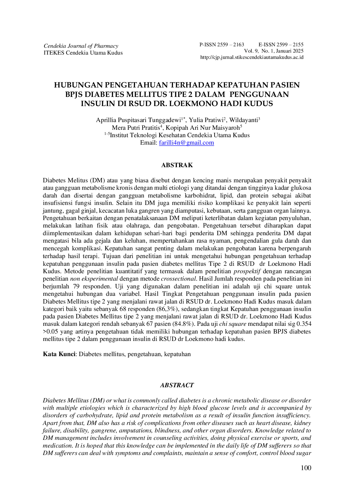 Cendekia Journal of PharmacyCendekia Journal of PharmacyDiabetes Melitus (DM) atau yang biasa disebut dengan kencing manis merupakan penyakit atau gangguan metabolisme kronis dengan multi etiologi yang ditandai dengan tingginya kadar glukosa darah dan disertai dengan gangguan metabolisme karbohidrat, lipid, dan protein sebagai akibat insufisiensi fungsi insulin. Selain itu DM juga memiliki risiko komplikasi ke penyakit lain seperti jantung, gagal ginjal, kecacatan luka gangren yang diamputasi, kebutaan, serta gangguan organ lainnya. Pengetahuan berkaitan dengan penatalaksanaan DM meliputi keterlibatan dalam kegiatan penyuluhan, melakukan latihan fisik atau olahraga, dan pengobatan. Pengetahuan tersebut diharapkan dapat diimplementasikan dalam kehidupan sehari-hari bagi penderita DM sehingga penderita DM dapat mengatasi bila ada gejala dan keluhan, mempertahankan rasa nyaman, pengendalian gula darah dan mencegah komplikasi. Kepatuhan sangat penting dalam melakukan pengobatan karena berpengaruh terhadap hasil terapi. Tujuan dari penelitian ini untuk mengetahui hubungan pengetahuan terhadap kepatuhan penggunaan insulin pada pasien diabetes mellitus Tipe 2 di RSUD dr Loekmono Hadi Kudus. Metode penelitian kuantitatif yang termasuk dalam penelitian prospektif dengan rancangan penelitian non eksperimental dengan metode crossectional. Hasil Jumlah responden pada penelitian ini berjumlah 79 responden. Uji yang digunakan dalam penelitian ini adalah uji chi square untuk mengetahui hubungan dua variabel. Hasil Tingkat Pengetahuan penggunaan insulin pada pasien Diabetes Mellitus tipe 2 yang menjalani rawat jalan di RSUD dr. Loekmono Hadi Kudus masuk dalam kategori baik yaitu sebanyak 68 responden (86,3%), sedangkan tingkat Kepatuhan penggunaan insulin pada pasien Diabetes Mellitus tipe 2 yang menjalani rawat jalan di RSUD dr. Loekmono Hadi Kudus masuk dalam kategori rendah sebanyak 67 pasien (84.8%). Pada uji chi square mendapat nilai sig 0.354 >0.05 yang artinya pengetahuan tidak memiliki hubungan terhadap kepatuhan pasien BPJS diabetes mellitus tipe 2 dalam penggunaan insulin di RSUD dr Loekmono hadi kudus.