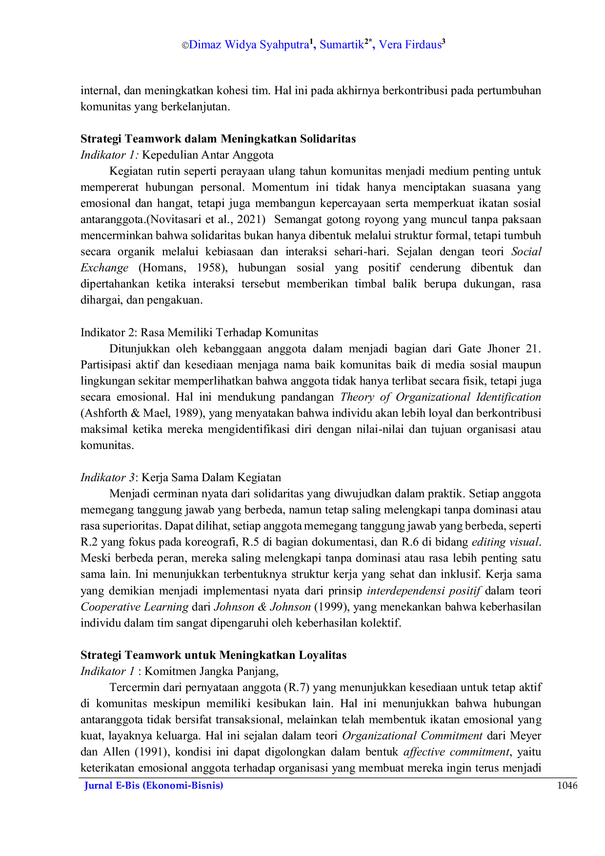 Jurnal E-BisJurnal E-BisKomunitas Gate Jhoner 21 merupakan salah satu komunitas pendukung sepak bola yang memiliki karakter kuat dalam kebersamaan. Penelitian ini bertujuan membahas strategi teamwork yang diterapkan komunitas dalam membangun sikap solidaritas, loyalitas, dan kreativitas Gate Jhoner 21, Persebaya Surabaya. Menggunakan metode kualitatif deskriptif, data dikumpulkan melalui observasi, dan wawancara. Hasil penelitian menunjukkan bahwa kegiatan seperti nonton bareng, aksi sosial, dan pelatihan kreatif mampu memperkuat rasa kebersamaan dan tanggung jawab antar anggota. Solidaritas dibentuk melalui interaksi rutin, loyalitas tumbuh dari partisipasi aktif dan rasa memiliki, sementara kreativitas difasilitasi melalui ruang ekspresi seperti desain konten dan koreografi. Meski menghadapi kendala seperti keterbatasan dana dan perbedaan karakter, strategi teamwork yang melibatkan komunikasi terbuka dan kepemimpinan partisipatif menjadi kunci dalam membangun komunitas yang solid dan aktif.