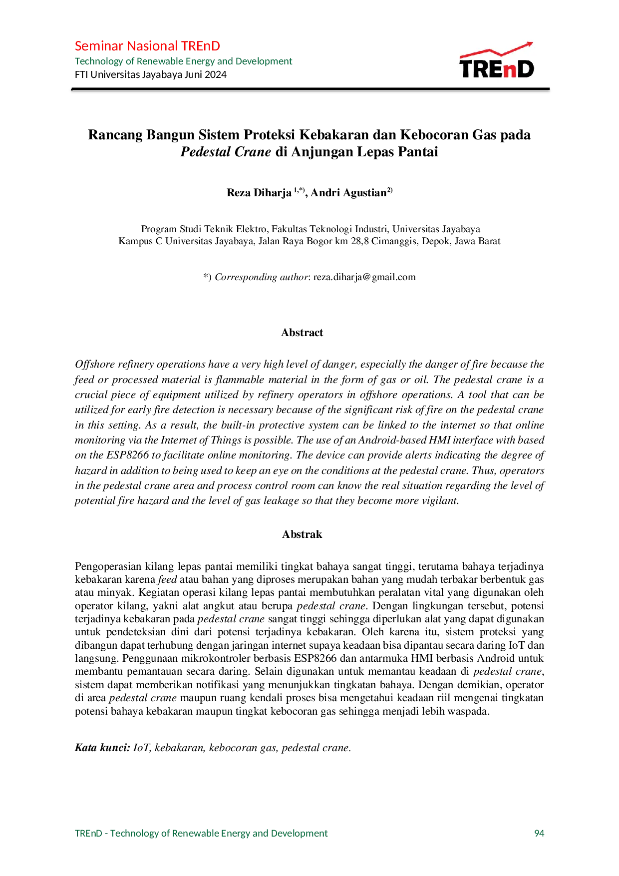 Proceeding Technology of Renewable Energy and Development ConferenceProceeding Technology of Renewable Energy and Development ConferencePengoperasian kilang lepas pantai memiliki tingkat bahaya sangat tinggi, terutama bahaya terjadinya kebakaran karena feed atau bahan yang diproses merupakan bahan yang mudah terbakar berbentuk gas atau minyak. Kegiatan operasi kilang lepas pantai membutuhkan peralatan vital yang digunakan oleh operator kilang, yakni alat angkut atau berupa pedestal crane. Dengan lingkungan tersebut, potensi terjadinya kebakaran pada pedestal crane sangat tinggi sehingga diperlukan alat yang dapat digunakan untuk pendeteksian dini dari potensi terjadinya kebakaran. Oleh karena itu, sistem proteksi yang dibangun dapat terhubung dengan jaringan internet supaya keadaan bisa dipantau secara daring IoT dan langsung. Penggunaan mikrokontroler berbasis ESP8266 dan antarmuka HMI berbasis Android untuk membantu pemantauan secara daring. Selain digunakan untuk memantau keadaan di pedestal crane, sistem dapat memberikan notifikasi yang menunjukkan tingkatan bahaya. Dengan demikian, operator di area pedestal crane maupun ruang kendali proses bisa mengetahui keadaan riil mengenai tingkatan potensi bahaya kebakaran maupun tingkat kebocoran gas sehingga menjadi lebih waspada.