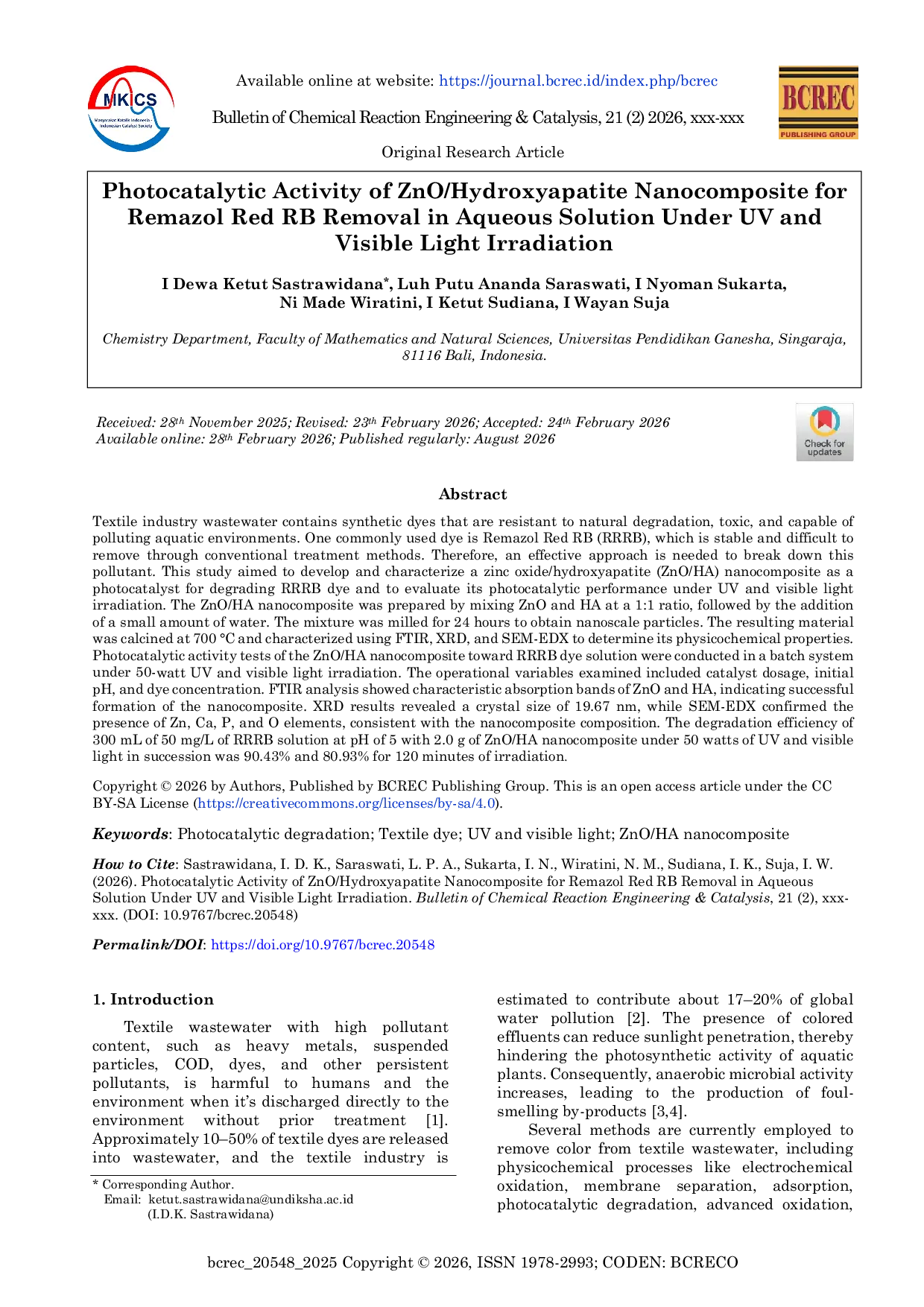 Bulletin of Chemical Reaction Engineering & CatalysisBulletin of Chemical Reaction Engineering & CatalysisIndustri tekstil menghasilkan limbah yang mengandung zat warna sintetis yang resisten terhadap degradasi alami, beracun, dan mampu mencemari lingkungan perairan. Salah satu zat warna yang umum digunakan adalah Remazol Red RB (RRRB), yang stabil dan sulit dihilangkan melalui metode pengolahan konvensional. Oleh karena itu, pendekatan yang efektif diperlukan untuk menguraikan polutan ini. Penelitian ini bertujuan untuk mengembangkan dan mengkarakterisasi nanokomposit seng oksida/hidroksiapatit (ZnO/HA) sebagai fotokatalis untuk mendegradasi zat warna RRRB dan mengevaluasi kinerja fotokatalitiknya di bawah iradiasi UV dan cahaya tampak. Nanokomposit ZnO/HA disiapkan dengan mencampurkan ZnO dan HA dengan rasio 1:1, diikuti dengan penambahan sejumlah kecil air. Campuran tersebut digiling selama 24 jam untuk mendapatkan partikel berukuran nano. Material yang dihasilkan dikalsinasi pada 700 °C dan dikarakterisasi menggunakan FTIR, XRD, dan SEM-EDX untuk menentukan sifat fisikokimianya. Uji aktivitas fotokatalitik nanokomposit ZnO/HA terhadap larutan zat warna RRRB dilakukan dalam sistem batch di bawah iradiasi UV dan cahaya tampak 50 watt. Variabel operasional yang diperiksa termasuk dosis katalis, pH awal, dan konsentrasi zat warna. Analisis FTIR menunjukkan pita serapan karakteristik ZnO dan HA, yang mengindikasikan pembentukan nanokomposit yang berhasil. Hasil XRD mengungkapkan ukuran kristal 19,67 nm, sementara SEM-EDX mengkonfirmasi adanya unsur Zn, Ca, P, dan O, sesuai dengan komposisi nanokomposit. Efisiensi degradasi 300 mL larutan 50 mg/L RRRB pada pH 5 dengan 2,0 g nanokomposit ZnO/HA di bawah UV dan cahaya tampak 50 watt secara berurutan adalah 90,43% dan 80,93% selama 120 menit iradiasi.