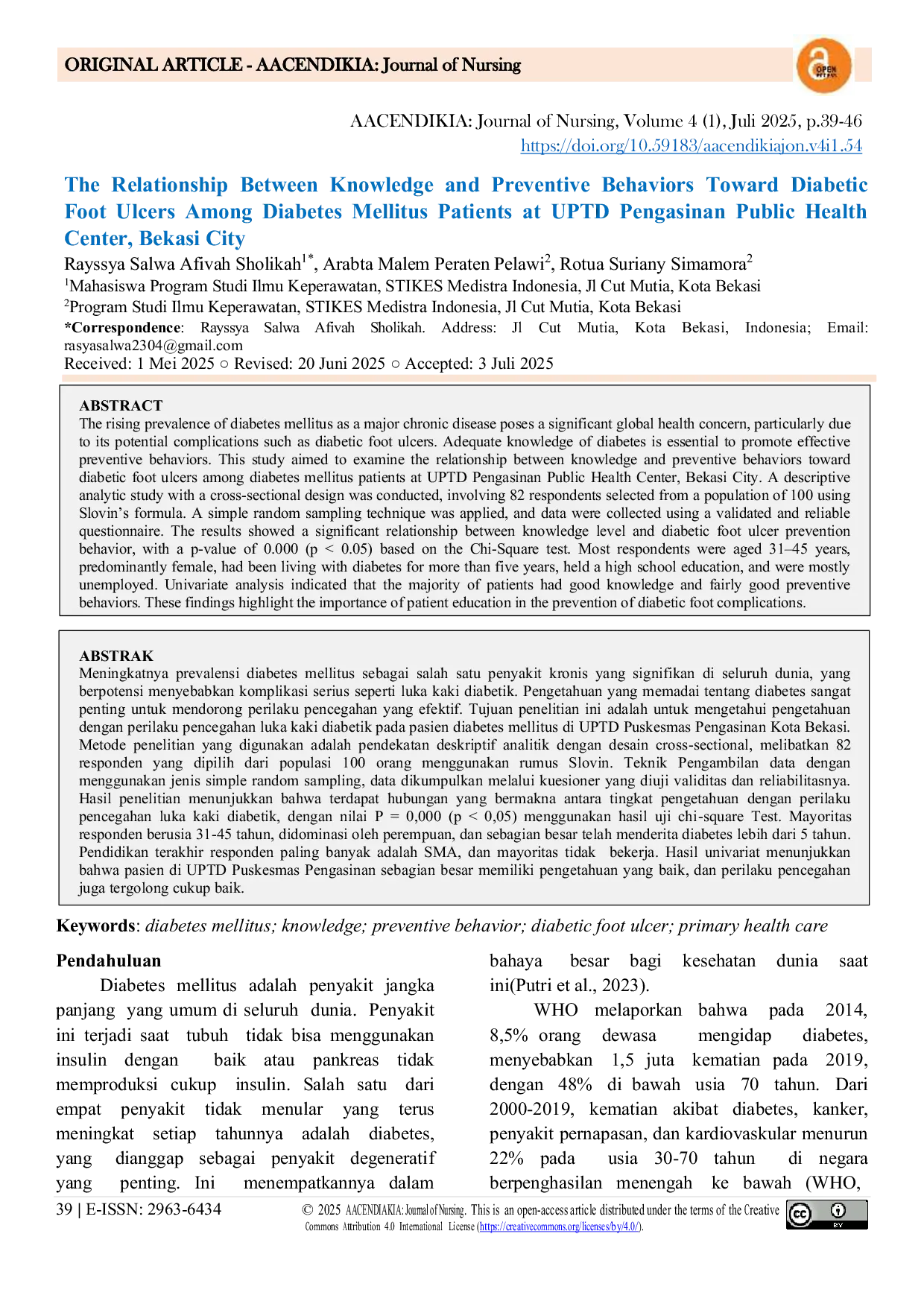 AACENDIKIA: Journal of NursingAACENDIKIA: Journal of NursingThe rising prevalence of diabetes mellitus as a major chronic disease poses a significant global health concern, particularly due to its potential complications such as diabetic foot ulcers. Adequate knowledge of diabetes is essential to promote effective preventive behaviors. This study aimed to examine the relationship between knowledge and preventive behaviors toward diabetic foot ulcers among diabetes mellitus patients at UPTD Pengasinan Public Health Center, Bekasi City. A descriptive analytic study with a cross-sectional design was conducted, involving 82 respondents selected from a population of 100 using Slovins formula. A simple random sampling technique was applied, and data were collected using a validated and reliable questionnaire. The results showed a significant relationship between knowledge level and diabetic foot ulcer prevention behavior, with a p-value of 0.000 (p < 0.05) based on the Chi-Square test. Most respondents were aged 31–45 years, predominantly female, had been living with diabetes for more than five years, held a high school education, and were mostly unemployed. Univariate analysis indicated that the majority of patients had good knowledge and fairly good preventive behaviors. These findings highlight the importance of patient education in the prevention of diabetic foot complications.