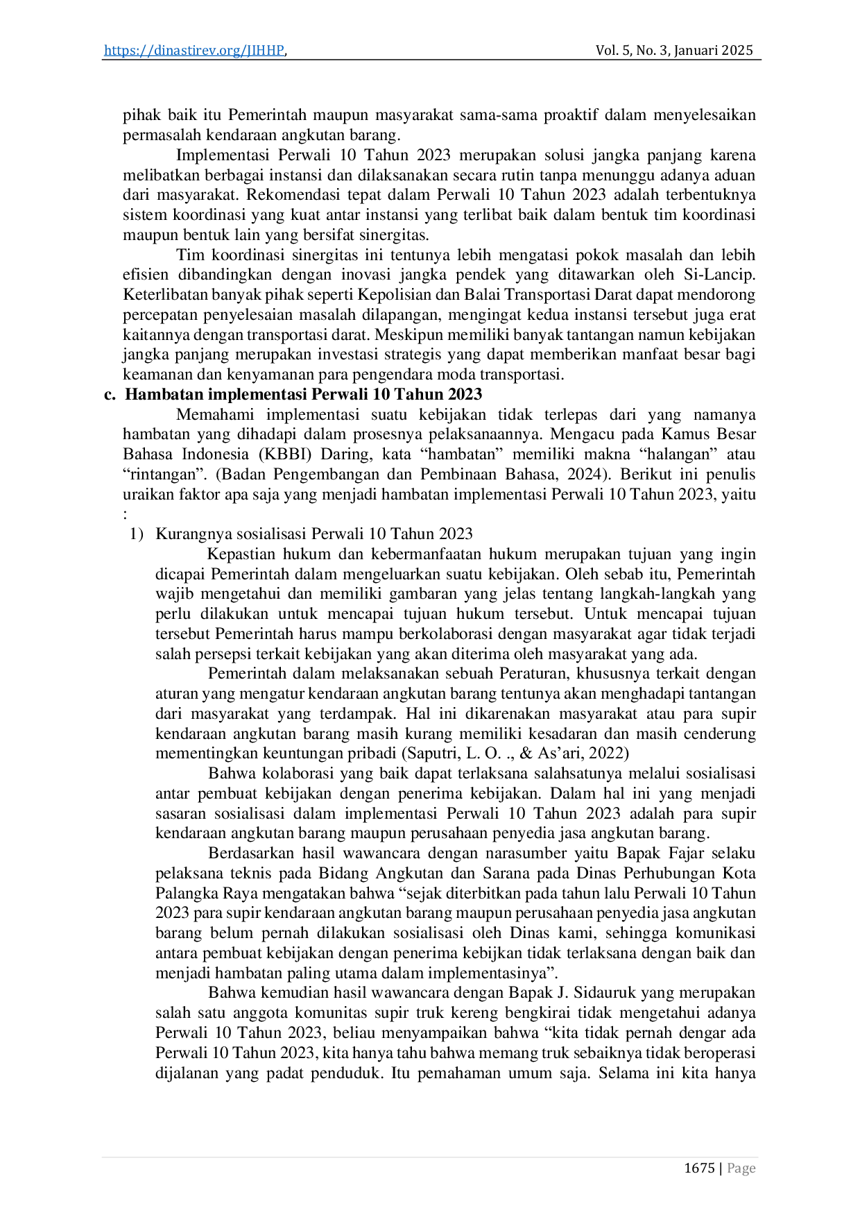 Jurnal Ilmu Hukum, Humaniora dan PolitikJurnal Ilmu Hukum, Humaniora dan PolitikKetidakteraturan rute dan jam operasional keluar masuk kendaraan angkutan barang dalam beroperasi di jalan raya dapat membahayakan keselamatan pengendara lain dan dapat menimbulkan kepadatan yang menggangu aktivitas masyarakat pada rute dan jam sibuk di Kota Palangka Raya. Untuk mengatasi masalah tersebut, Pemerintah Kota Palangka Raya menerbitkan Peraturan Walikota Palangka Raya Nomor 10 Tahun 2023 tentang Pengaturan Rute dan Jam Operasional Keluar Masuk Kendaraan Angkutan Barang di Kota Palangka Raya. Penelitian ini bertujuan untuk menggali pemahaman tentang penerapan kebijakan tersebut serta memahami hambatan pelaksanaannya. Dengan metode yuridis empiris melalui observasi, wawancara, dan analisis data media online, ditemukan bahwa implementasi peraturan ini belum sepenuhnya efektif karena kurangnya koordinasi antar instansi terkait, minimnya sosialisasi, dan keterbatasan sumber daya manusia. Untuk sementara, Dinas Perhubungan Kota Palangka Raya melakukan inovasi Sistem Layanan Citra Perhubungan. Namun, inovasi ini hanya merupakan solusi jangka pendek. Penelitian ini merekomendasikan pembentukan tim koordinasi lintas sektor untuk mempercepat implementasi yang lebih berkelanjutan.