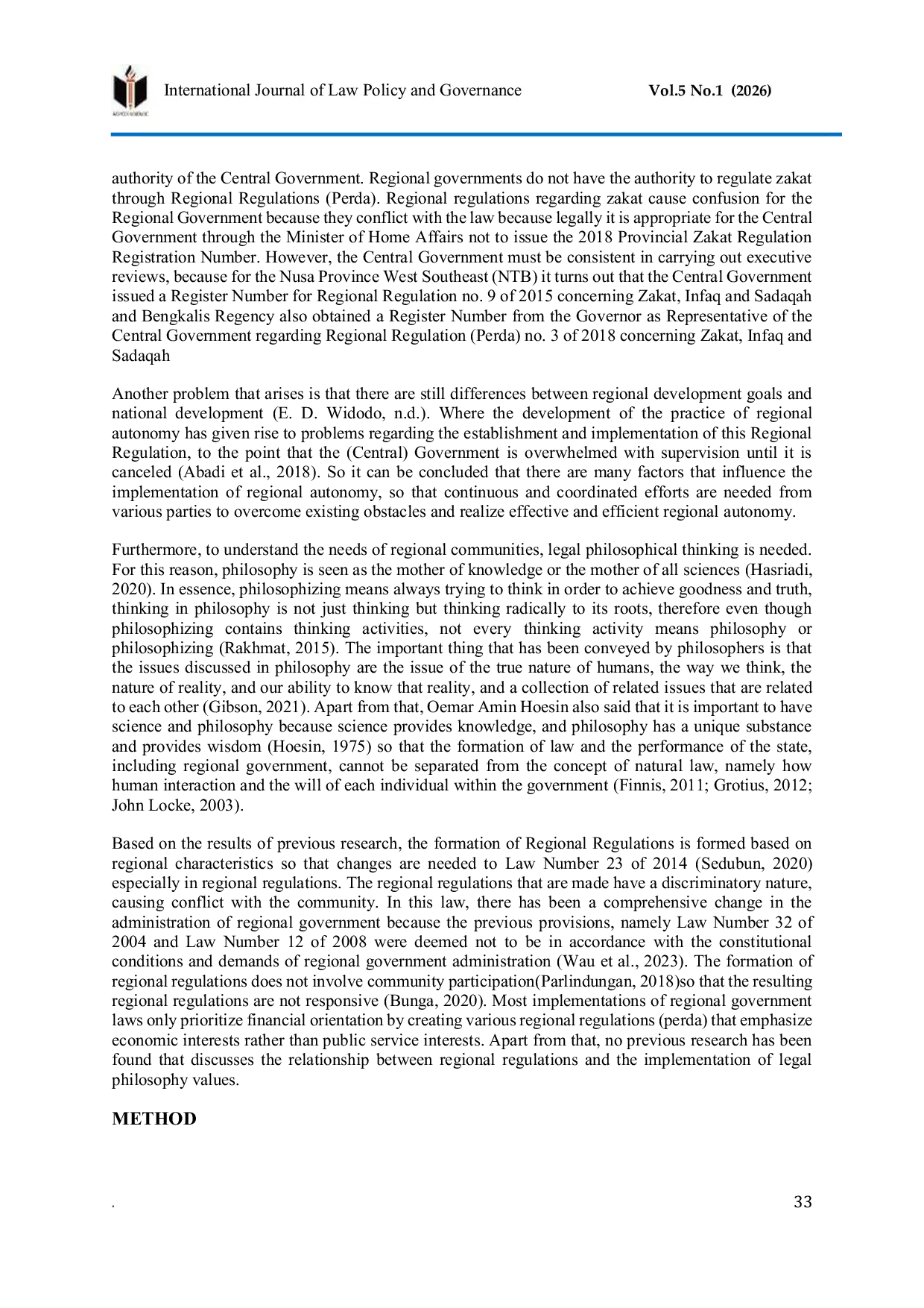 International Journal of Law Policy and GovernanceInternational Journal of Law Policy and GovernanceThe purpose of this study is to analyze the application of legal philosophy values in the formation of regional regulations in Indonesia, as well as to examine the suitability between legal philosophy values and regional regulations that have been formed. This study uses a descriptive analytical research type with a normative legal approach method. Research data were obtained from primary, secondary and primary legal materials. Data collection techniques were carried out qualitatively. The results of the study indicate that the application of legal philosophy values in the formation of regional regulations in Indonesia is still not optimal. This is due to several factors, such as a lack of understanding of the values of legal philosophy among regional regulation makers, minimal community participation in the process of forming regional regulations, and weak law enforcement. This study has limitations in its focus on the application of legal philosophy values and a lack of analysis of the impact of regional regulations that do not follow these values.