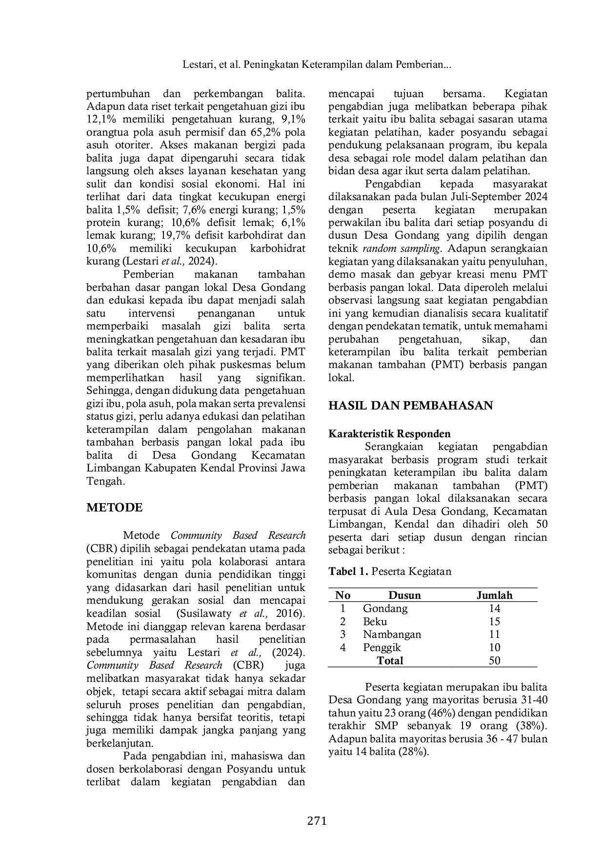 CARADDECARADDEPemberian makanan yang bervariasi dan jumlah asupan kalori yang sesuai akan menghasilkan status gizi baik pada balita. Pengabdian ini bertujuan untuk meningkatkan keterampilan ibu balita dalam memanfaatkan pangan lokal menjadi berbagai menu PMT untuk menangani masalah gizi di Desa Gondang. Metode yang digunakan yaitu metode Community Based Research (CBR) dengan melibatkan 50 peserta ibu balita yang dipilih secara random sampling dari setiap posyandu di dusun Desa Gondang. Data diperoleh melalui observasi langsung saat kegiatan pengabdian yang kemudian dianalisis secara kualitatif dengan pendekatan tematik. Hasil penelitian menunjukkan bahwa sebanyak 50 ibu mengalami peningkatan pengetahuan setelah dilakukan penyuluhan. Menu PMT brownis alpukat, pudding alpukat dan bakpia kukus alpukat hingga menu dimsum lele dan nugget lele merupakan menu kreatif ibu balita Desa Gondang pada pelaksanaan demo masak dan gebyar kreasi yang mudah diimplementasikan. Pengembangan pengetahuan dan keterampilan melalui penyuluhan PMT, demo masak dan gebyar kreasi dapat meningkatkan keterampilan ibu balita dalam membuat menu PMT berbahan dasar pangan lokal Desa Gondang.
