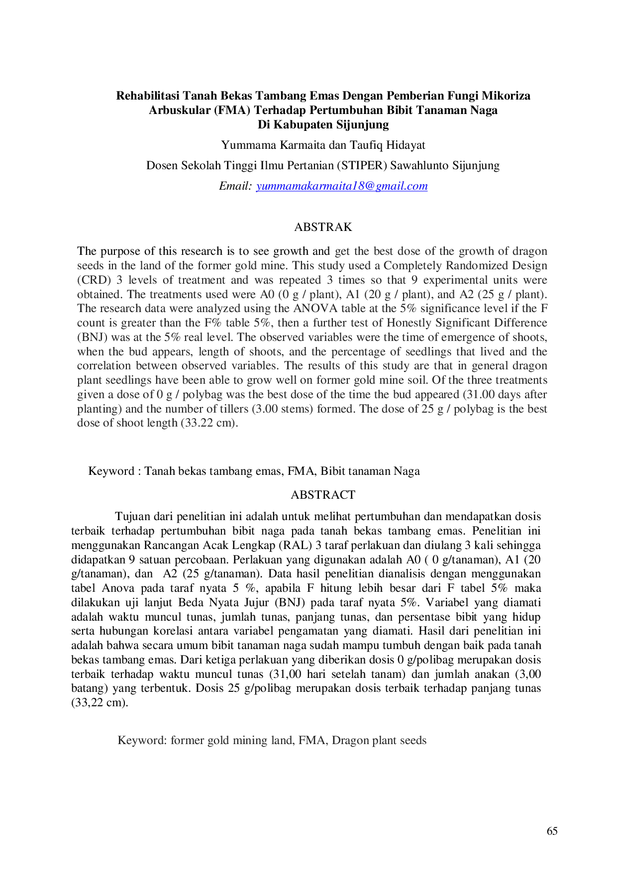 Penelitian lanjutan perlu dilakukan untuk mengkaji lebih dalam interaksi antara jenis FMA yang berbeda dengan karakteristik tanah bekas tambang emas di Kabupaten Sijunjung, termasuk analisis kandungan logam berat dan sifat fisikokimia tanah secara detail. Selain itu, studi lebih lanjut dapat difokuskan pada efektivitas kombinasi FMA dengan agen bioremediasi lainnya, seperti bakteri pelarut fosfat atau mikroorganisme penghasil siderofor, untuk meningkatkan serapan hara dan mengurangi toksisitas logam berat pada tanaman naga. Terakhir, penelitian perlu dilakukan untuk mengevaluasi dampak jangka panjang dari aplikasi FMA terhadap kualitas tanah dan keberlanjutan produksi tanaman naga di lahan bekas tambang, termasuk analisis biaya-manfaat dan potensi adopsi teknologi ini oleh petani lokal.