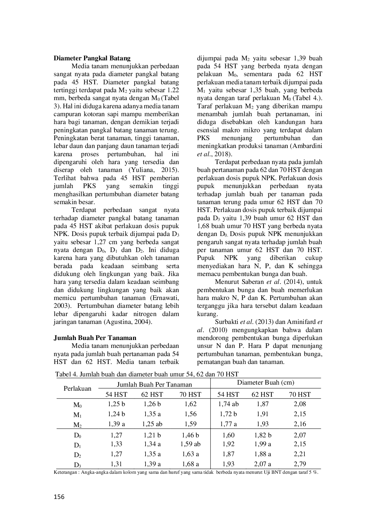 Media tanam berpengaruh pada tinggi tanaman, jumlah daun, diameter pangkal batang, jumlah buah pertanaman, diameter buah pertanaman, hasil terbaik terdapat pada M2 (Tanah PKS 3.Dosis pupuk NPK berpengaruh pada tinggi tanaman, jumlah daun, diameter pangkal batang, diameter buah serta berat buah pertanaman, hasil terbaik diperoleh pada D3 (NPK 250 kg/ha).Tidak terjadi interaksi antara media tanam dan dosis pupuk NPK terhadap semua peubah yang diamati.