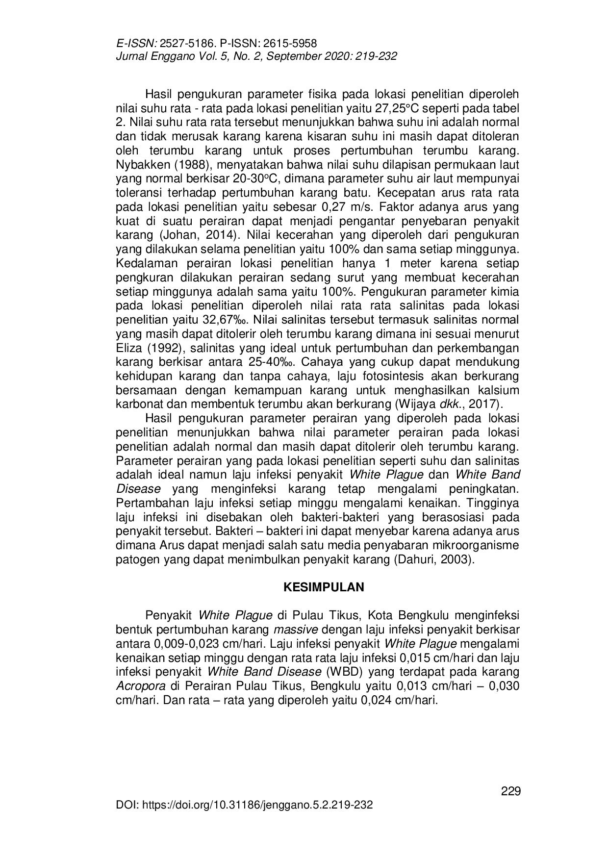 Jurnal EngganoJurnal EngganoPenyakit karang adalah gangguan terhadap kesehatan karang yang menyebabkan gangguan secara fisiologis bagi biota karang. Penyakit karang dapat memberikan dampak buruk terhadap proses pertumbuhan karang hingga dapat menyebabkan kematian karang disuatu perairan. Dampak dari penyakit karang terhadap ekosistem terumbu karang sangat besar, selain mengakibatkan kematian karang dalam skala yang luas, penyakit karang juga berdampak pada berkurangnya tingkat keanekaragaman sumberdaya alam. Penelitian ini bertujuan untuk mengetahui dan menganalisis laju infeksi penyakit White Plague dan White Band Disease di perairan Pulau Tikus, Kota Bengkulu. Penelitian ini dilaksanakan pada bulan September-Oktober 2019 di Perairan Pulau Tikus, Kota Bengkulu. Metode yang digunakan dalam penelitian ini adalah metode survei, pengamatan dan pengukuran langsung di Lapangan. Hasil Penelitian ini didapatkan bentuk pertumbuhan yang terinfeksi penyakit White Plague di Perairan Pulau Tikus Kota Bengkulu adalah bentuk pertumbuhan karang Massive dan penyakit White Band Disease pada karang Acropora. Laju infeksi penyakit White Plague di perairan Pulau Tikus Kota Bengkulu adalah 0,009 - 0,023 cm/hari. Laju infeksi penyakit White Plague mengalami kenaikan setiap minggu dengan rata rata laju infeksi 0,015 cm/hari dan nilai laju infeksi penyakit White Band Disease yang terdapat pada karang Acropora di Perairan Pulau Tikus, Bengkulu yaitu 0,013 cm/hari – 0,030 cm/hari. Rata – rata yang diperoleh yaitu 0,024 cm/hari. Nilai laju infeksi karang menandakan bahwa sebagian besar kerusakan terumbu karang diakibatkan oleh penyakit karang.