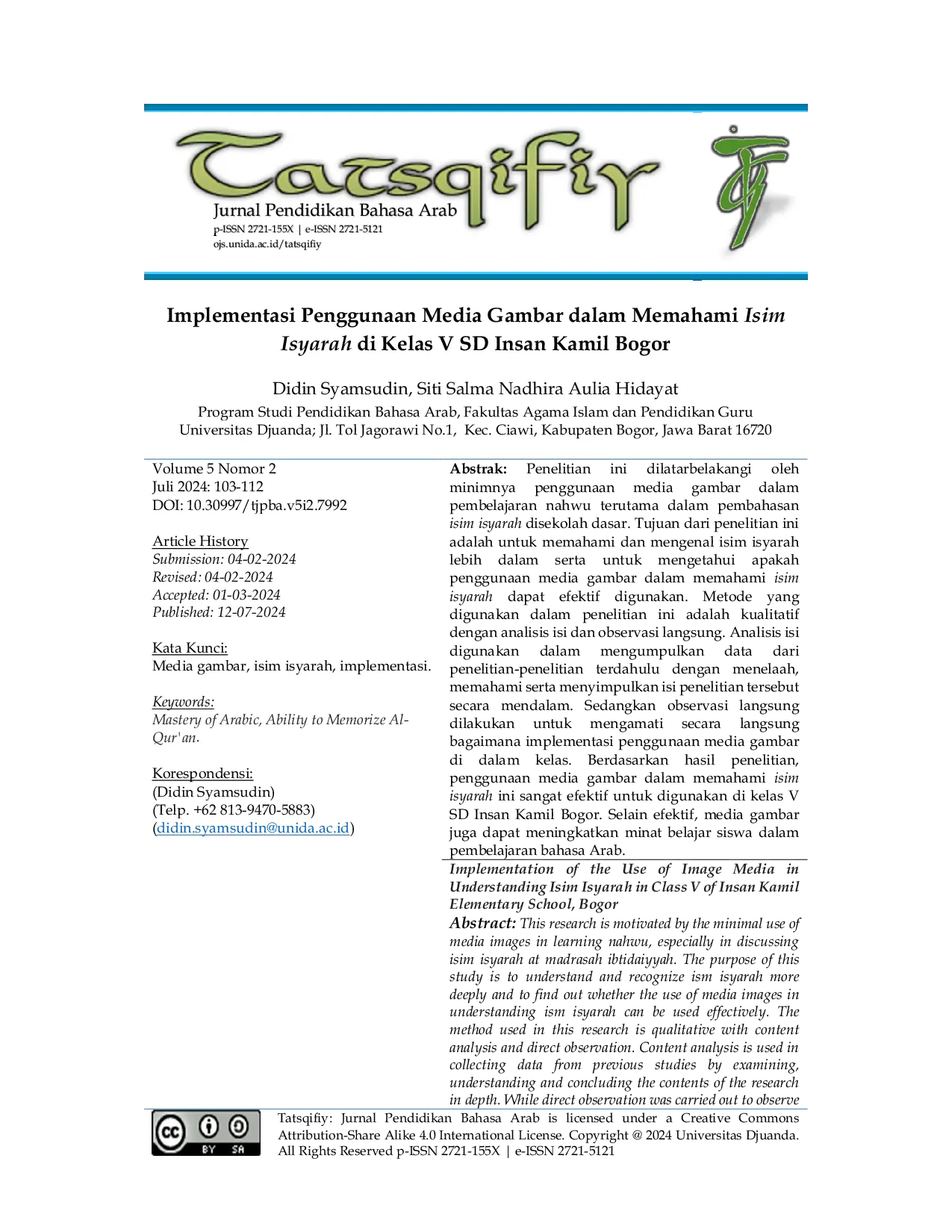 Tatsqifiy: Jurnal Pendidikan Bahasa ArabTatsqifiy: Jurnal Pendidikan Bahasa ArabPenelitian ini dilatarbelakangi oleh minimnya penggunaan media gambar dalam pembelajaran nahwu terutama dalam pembahasan isim isyarah di sekolah dasar. Tujuan dari penelitian ini adalah untuk memahami dan mengenal isim isyarah lebih dalam serta untuk mengetahui apakah penggunaan media gambar dalam memahami isim isyarah dapat efektif digunakan. Metode yang digunakan dalam penelitian ini adalah kualitatif dengan analisis isi dan observasi langsung. Analisis isi digunakan dalam mengumpulkan data dari penelitian-penelitian terdahulu dengan menelaah, memahami serta menyimpulkan isi penelitian tersebut secara mendalam. Sedangkan observasi langsung dilakukan untuk mengamati langsung bagaimana implementasi penggunaan media gambar di dalam kelas. Berdasarkan hasil penelitian, penggunaan media gambar dalam memahami isim isyarah ini sangat efektif untuk digunakan di kelas V SD Insan Kamil Bogor. Selain efektif, media gambar juga dapat meningkatkan minat belajar siswa dalam pembelajaran bahasa Arab.