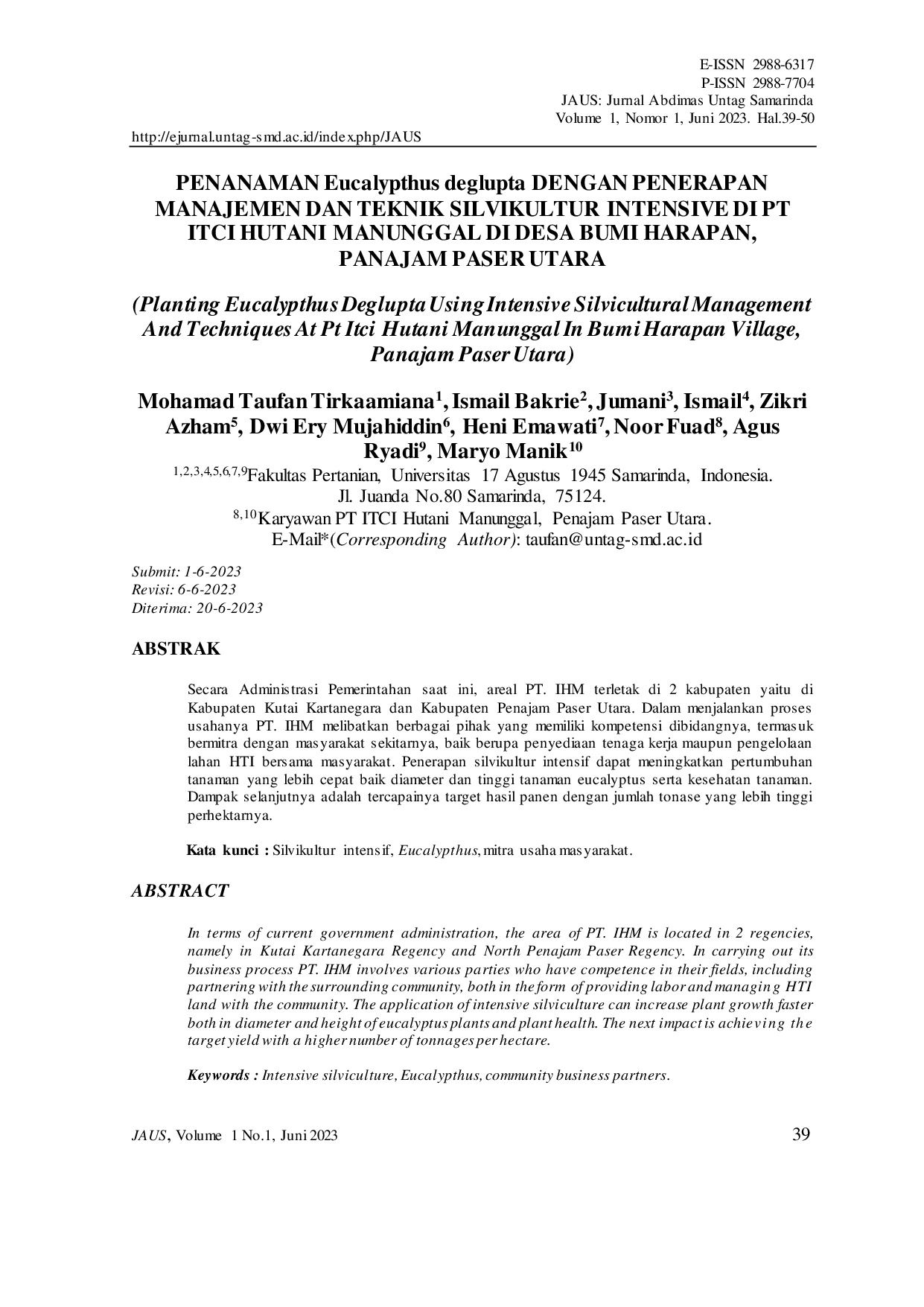 JURNAL ABDIMAS UNTAG SAMARINDAJURNAL ABDIMAS UNTAG SAMARINDASecara Administrasi Pemerintahan saat ini, areal PT. IHM terletak di 2 kabupaten yaitu di Kabupaten Kutai Kartanegara dan Kabupaten Penajam Paser Utara. Dalam menjalankan proses usahanya PT. IHM melibatkan berbagai pihak yang memiliki kompetensi dibidangnya, termasuk bermitra dengan masyarakat sekitarnya, baik berupa penyediaan tenaga kerja maupun pengelolaan lahan HTI bersama masyarakat. Penerapan silvikultur intensif dapat meningkatkan pertumbuhan tanaman yang lebih cepat baik diameter dan tinggi tanaman eucalyptus serta kesehatan tanaman. Dampak selanjutnya adalah tercapainya target hasil panen dengan jumlah tonase yang lebih tinggi perhektarnya.