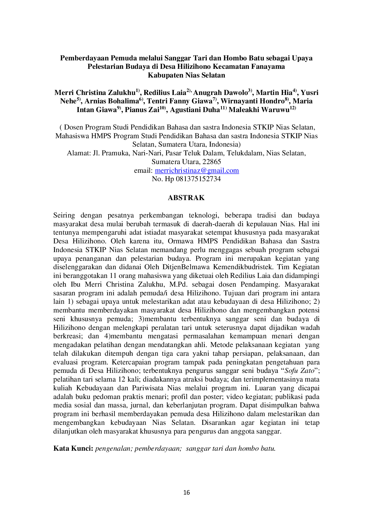 Haga : Jurnal Pengabdian Kepada MasyarakatHaga : Jurnal Pengabdian Kepada MasyarakatSeiring dengan pesatnya perkembangan teknologi, beberapa tradisi dan budaya masyarakat desa mulai berubah termasuk di daerah-daerah di kepulauan Nias. Hal ini tentunya mempengaruhi adat istiadat masyarakat setempat khususnya pada masyarakat Desa Hilizihono. Oleh karena itu, Ormawa HMPS Pendidikan Bahasa dan Sastra Indonesia STKIP Nias Selatan memandang perlu menggagas sebuah program sebagai upaya penanganan dan pelestarian budaya. Program ini merupakan kegiatan yang diselenggarakan dan didanai Oleh DitjenBelmawa Kemendikbudristek. Tim Kegiatan ini beranggotakan 11 orang mahasiswa yang diketuai oleh Redilius Laia dan didampingi oleh Ibu Merri Christina Zalukhu, M.Pd. sebagai dosen Pendamping. Masyarakat sasaran program ini adalah pemuda/i desa Hilizihono. Tujuan dari program ini antara lain 1) sebagai upaya untuk melestarikan adat atau kebudayaan di desa Hilizihono; 2) membantu memberdayakan masyarakat desa Hilizihono dan mengembangkan potensi seni khususnya pemuda; 3)membantu terbentuknya sanggar seni dan budaya di Hilizihono dengan melengkapi peralatan tari untuk seterusnya dapat dijadikan wadah berkreasi; dan 4)membantu mengatasi permasalahan kemampuan menari dengan mengadakan pelatihan dengan mendatangkan ahli. Metode pelaksanaan kegiatan yang telah dilakukan ditempuh dengan tiga cara yakni tahap persiapan, pelaksanaan, dan evaluasi program. Ketercapaian program tampak pada peningkatan pengetahuan para pemuda di Desa Hilizihono; terbentuknya pengurus sanggar seni budaya โSofu Zato; pelatihan tari selama 12 kali; diadakannya atraksi budaya; dan terimplementasinya mata kuliah Kebudayaan dan Pariwisata Nias melalui program ini. Luaran yang dicapai adalah buku pedoman praktis menari; profil dan poster; video kegiatan; publikasi pada media sosial dan massa, jurnal, dan keberlanjutan program. Dapat disimpulkan bahwa program ini berhasil memberdayakan pemuda desa Hilizihono dalam melestarikan dan mengembangkan kebudayaan Nias Selatan. Disarankan agar kegiatan ini tetap dilanjutkan oleh masyarakat khususnya para pengurus dan anggota sanggar.
