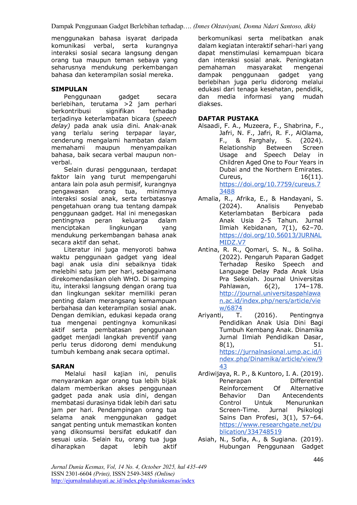 Jurnal Dunia KesmasJurnal Dunia KesmasKemajuan teknologi digital yang pesat saat ini telah mendorong peningkatan penggunaan gadget pada anak usia dini. Meskipun dapat memberikan manfaat edukatif, penggunaan gadget yang berlebihan dan tanpa pengawasan dapat berdampak negatif terhadap perkembangan bicara anak. Studi literatur ini bertujuan untuk mengetahui hubungan antara durasi dan intensitas penggunaan gadget dengan kejadian speech delay serta faktor risiko lain seperti pola asuh, pengetahuan orang tua, dan interaksi sosial pada anak usia dini 0-6 tahun.