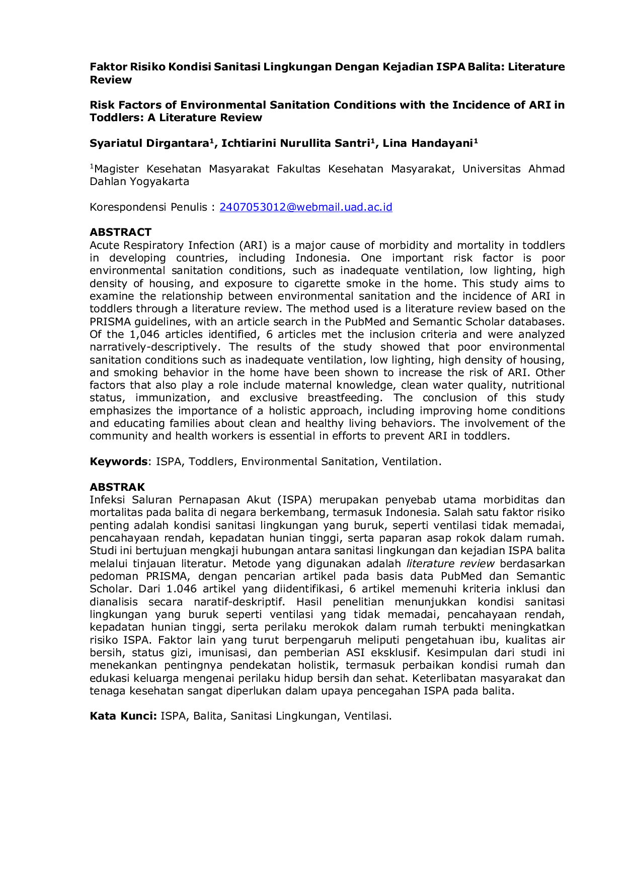 Jurnal Dunia KesmasJurnal Dunia KesmasInfeksi Saluran Pernapasan Akut (ISPA) merupakan penyebab utama morbiditas dan mortalitas pada balita di negara berkembang, termasuk Indonesia. Salah satu faktor risiko penting adalah kondisi sanitasi lingkungan yang buruk, seperti ventilasi tidak memadai, pencahayaan rendah, kepadatan hunian tinggi, serta paparan asap rokok dalam rumah. Studi ini bertujuan mengkaji hubungan antara sanitasi lingkungan dan kejadian ISPA balita melalui tinjauan literatur. Metode yang digunakan adalah literature review berdasarkan pedoman PRISMA, dengan pencarian artikel pada basis data PubMed dan Semantic Scholar. Dari 1.046 artikel yang diidentifikasi, 6 artikel memenuhi kriteria inklusi dan dianalisis secara naratif-deskriptif. Hasil penelitian menunjukkan kondisi sanitasi lingkungan yang buruk seperti ventilasi yang tidak memadai, pencahayaan rendah, kepadatan hunian tinggi, serta perilaku merokok dalam rumah terbukti meningkatkan risiko ISPA. Faktor lain yang turut berpengaruh meliputi pengetahuan ibu, kualitas air bersih, status gizi, imunisasi, dan pemberian ASI eksklusif. Kesimpulan dari studi ini menekankan pentingnya pendekatan holistik, termasuk perbaikan kondisi rumah dan edukasi keluarga mengenai perilaku hidup bersih dan sehat. Keterlibatan masyarakat dan tenaga kesehatan sangat diperlukan dalam upaya pencegahan ISPA pada balita.