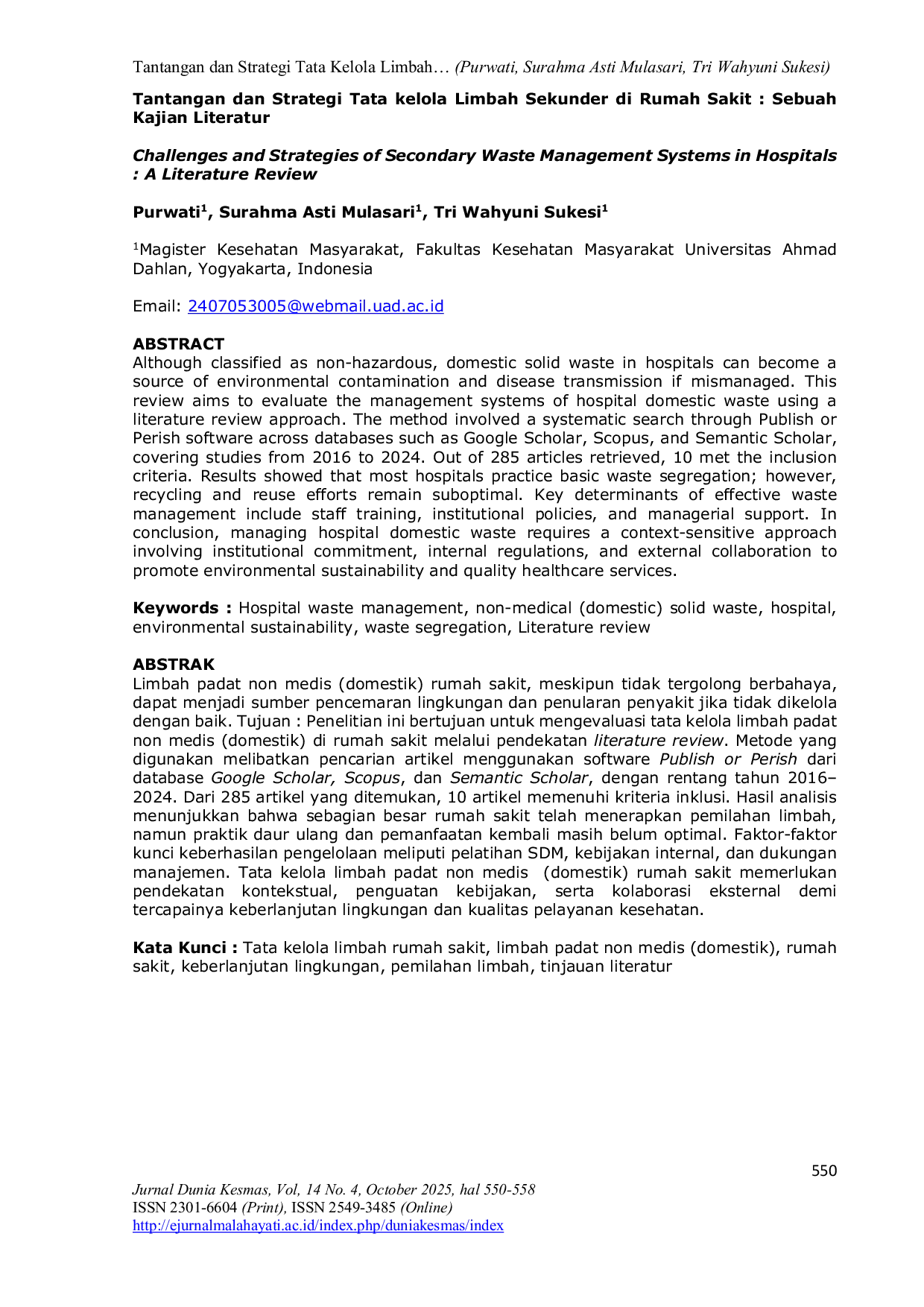 Jurnal Dunia KesmasJurnal Dunia KesmasLimbah padat non medis (domestik) rumah sakit, meskipun tidak tergolong berbahaya, dapat menjadi sumber pencemaran lingkungan dan penularan penyakit jika tidak dikelola dengan baik. Penelitian ini bertujuan untuk mengevaluasi tata kelola limbah padat non medis (domestik) di rumah sakit melalui pendekatan literature review. Metode yang digunakan melibatkan pencarian artikel menggunakan software Publish or Perish dari database Google Scholar, Scopus, dan Semantic Scholar, dengan rentang tahun 2016–2024. Dari 285 artikel yang ditemukan, 10 artikel memenuhi kriteria inklusi. Hasil analisis menunjukkan bahwa sebagian besar rumah sakit telah menerapkan pemilahan limbah, namun praktik daur ulang dan pemanfaatan kembali masih belum optimal. Faktor-faktor kunci keberhasilan pengelolaan meliputi pelatihan SDM, kebijakan internal, dan dukungan manajemen. Tata kelola limbah padat non medis (domestik) rumah sakit memerlukan pendekatan kontekstual, penguatan kebijakan, serta kolaborasi eksternal demi tercapainya keberlanjutan lingkungan dan kualitas pelayanan kesehatan.