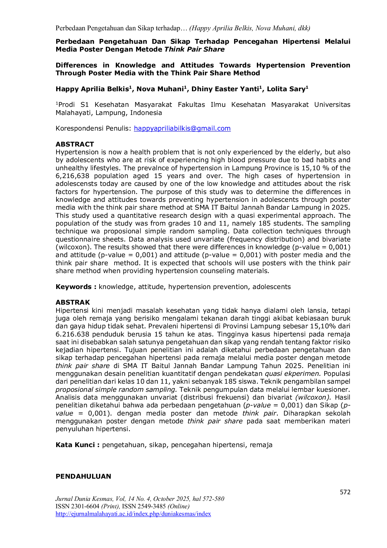 Jurnal Dunia KesmasJurnal Dunia KesmasHipertensi kini menjadi masalah kesehatan yang tidak hanya dialami oleh lansia, tetapi juga oleh remaja yang berisiko mengalami tekanan darah tinggi akibat kebiasaan buruk dan gaya hidup tidak sehat. Prevalensi hipertensi di Provinsi Lampung sebesar 15,10% dari 6.216.638 penduduk berusia 15 tahun ke atas. Tingginya kasus hipertensi pada remaja saat ini disebabkan salah satunya pengetahuan dan sikap yang rendah tentang faktor risiko kejadian hipertensi. Tujuan penelitian ini adalah untuk mengetahui perbedaan pengetahuan dan sikap terhadap pencegahan hipertensi pada remaja melalui media poster dengan metode think pair share di SMA IT Baitul Jannah Bandar Lampung Tahun 2025. Penelitian ini menggunakan desain penelitian kuantitatif dengan pendekatan quasi ekperimen. Populasi dari penelitian dari kelas 10 dan 11, yakni sebanyak 185 siswa. Teknik pengambilan sampel proposional simple random sampling. Teknik pengumpulan data melalui lembar kuesioner. Analisis data menggunakan unvariat (distribusi frekuensi) dan bivariat (wilcoxon). Hasil penelitian diketahui bahwa ada perbedaan pengetahuan (p-value = 0,001) dan sikap (p-value = 0,001) dengan media poster dan metode think pair share. Diharapkan sekolah menggunakan poster dengan metode think pair share pada saat memberikan materi penyuluhan hipertensi.