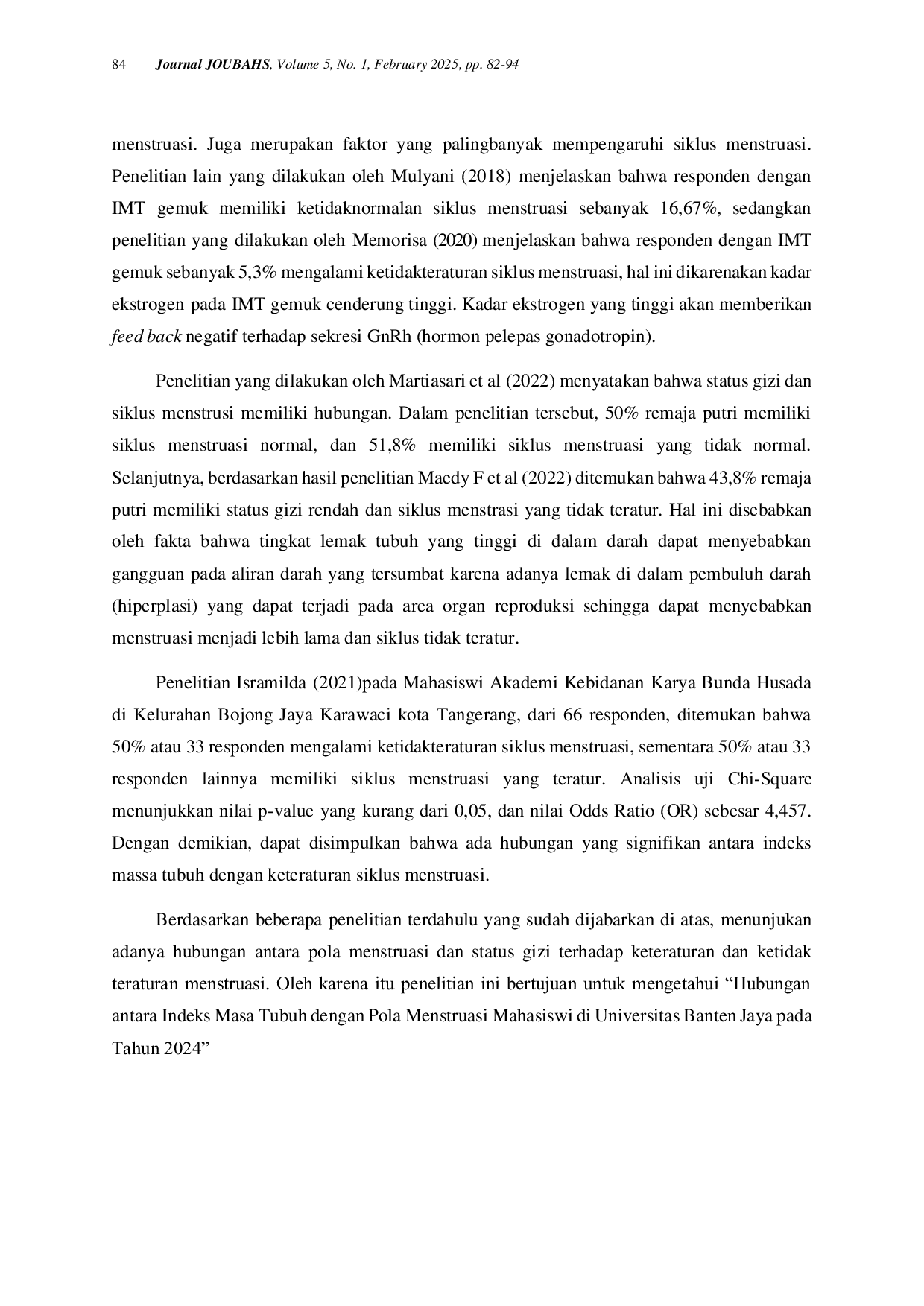 Just a moment...Just a moment...Siklus menstruasi menjadi indikator klinis fungsi reproduksi pada wanita. Panjang siklus menstruasi telah dikenal sebagai prediktor kesehatan, seperti risiko kanker payudara dan faktor risiko kardiovaskular, ketidakteraturan menstruasi adalah masalah yang paling umum dialami oleh remaha berusia 15 hingga 19 tahun. Jika masalah ini tidak ditangani segera, hal ini akan berdampak pada kesehatan reproduksi remaja tersebut saat tumbuh menjadi wanita usia subur. Tujuan penelitian ini adalah untuk mengetahui hubungan antara Indeks Massa Tubuh (IMT) dengan Pola Menstruasi. Penelitian dilakukan di Universitas Banten Jaya, dengan desain penelitian Cross-Sectional. Jumlah sampel yang diambil adalah 159 orang dengan rumus uji hipotesis beda dua proporsi. Teknik analisa data yang digunakan adalah analisis univariat dan bivariat dengan menggunakan Uji Chi Square. Analisis regresi berganda digunakan untuk mengetahui interaksi variabel confounding pada Indeks Massa Tubuh. Hasil penelitian ditemukan bahwa mayoritas responden memiliki pola menstruasi tidak normal (95,6%) dengan IMT tidak beresiko (62,9%). Analisis bivariat menunjukkan bahwa mayoritas IMT beresiko mengalami menstruasi tidak normal (91,5%) dengan nilai p-value sebesar 0,102, yang menunjukkan tidak ada hubungan antara IMT dan pola menstruasi pada mahasiswi di Universitas Banten Jaya (pv = 0,102 > 0,05). Analisis regresi berganda menunjukkan bahwa interaksi confounding tidak ditemukan dalam penelitian ini, artinya variabel Usia, Tingkat Pendapatan, dan Pengetahuan tidak menjadi variabel perancu dalam hubungan antara indeks massa tubuh (IMT) dan pola menstruasi.