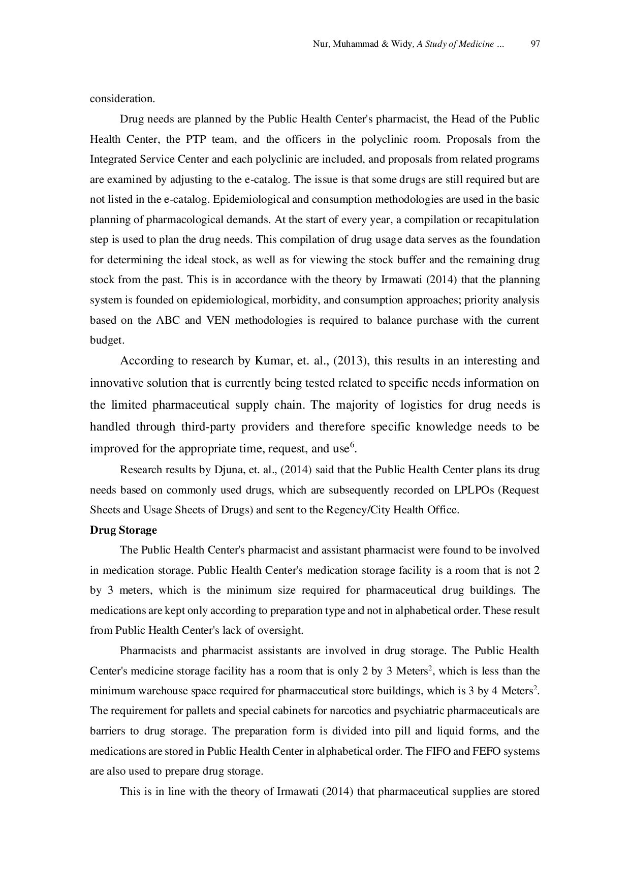 Just a moment...Just a moment...Pengeluaran farmasi Indonesia sekitar 40% dan dianggap tinggi. Manajemen pengobatan yang tidak efisien menyebabkan berkurangnya ketersediaan obat, kekurangan obat, penumpukan banyak obat akibat jadwal pemberian dosis yang tidak tepat, serta meningkatnya biaya obat akibat penggunaan obat yang tidak rasional. Tujuan dari penelitian ini adalah untuk mengevaluasi kebutuhan obat, penyimpanan dan penggunaan obat, distribusi obat, pengumpulan obat dan rencana pelaporan di pusat kesehatan masyarakat. Desain penelitian kualitatif dengan pendekatan studi kasus yang dilakukan pada tahun 2017 di seluruh Puskesmas wilayah kerja Dinas Kesehatan Kota Palu. Informan utama untuk penelitian ini adalah direktur pusat kesehatan masyarakat. Studi ini menemukan bahwa meskipun perencanaan kebutuhan obat‑obatan di pusat kesehatan masyarakat dilakukan bekerja sama dengan layanan kesehatan, beberapa obat‑obatan dibutuhkan tetapi tidak termasuk dalam katalog elektronik. Penyimpanan obat‑obatan di pusat kesehatan dilakukan berdasarkan sistem FIFO dan FEFO. Namun, keterbatasannya mencakup suhu yang tidak memenuhi persyaratan dan kurangnya lemari khusus untuk narkotika dan zat psikotropika. Masih terdapat obat‑obatan kosong yang menghambat penyaluran obat kepada pasien dan mempengaruhi efektivitas serta efisiensi pelayanan. Kesimpulannya, masih terdapat kendala dalam pengelolaan obat di puskesmas, mulai dari perencanaan kebutuhan, penyimpanan, penyaluran, pengambilan dan pelaporan obat, yang berujung pada terjadinya kadaluarsa.
