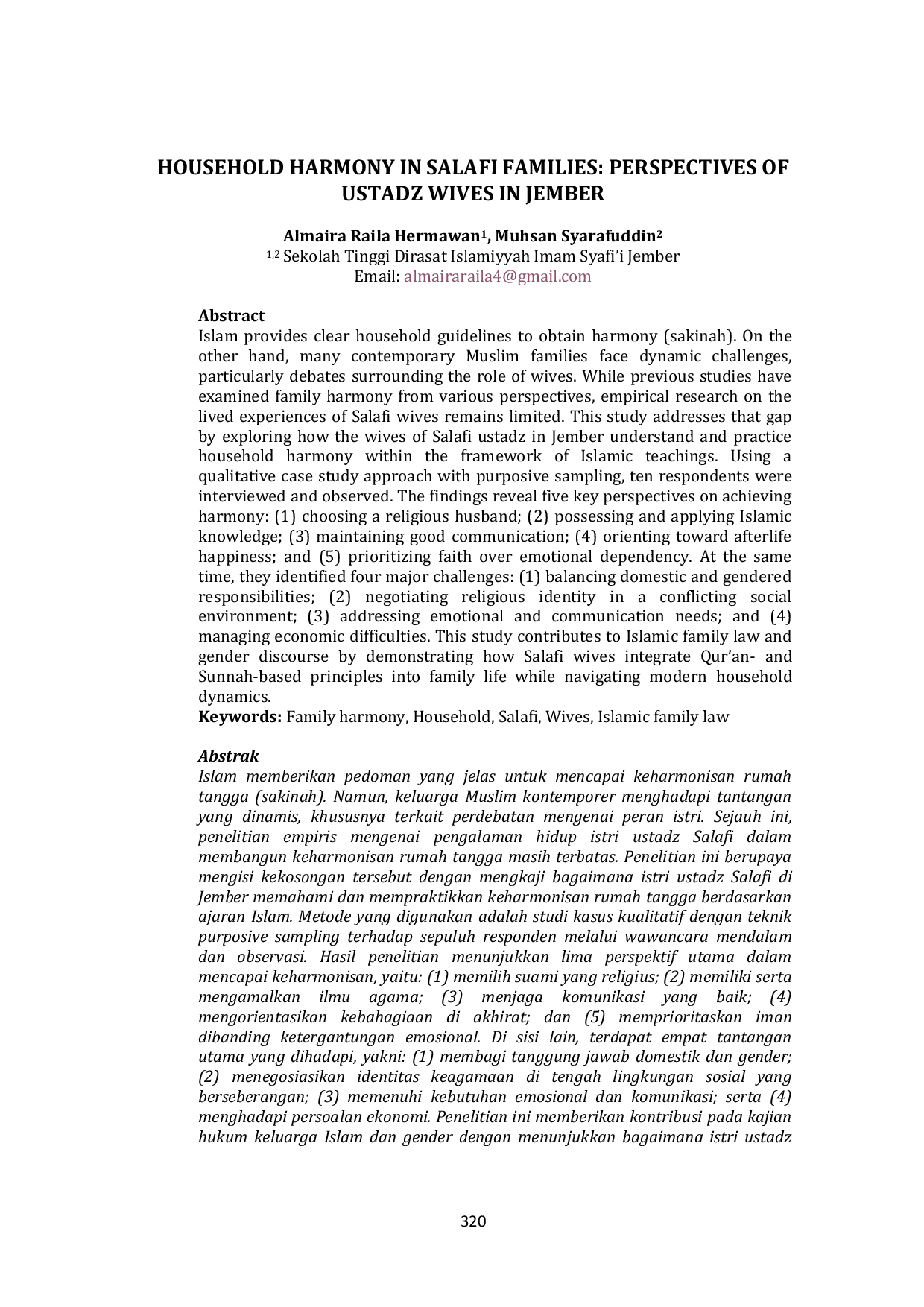 Familia: Jurnal Hukum KeluargaFamilia: Jurnal Hukum KeluargaIslam provides clear household guidelines to obtain harmony (sakinah). However, many contemporary Muslim families face dynamic challenges, particularly debates surrounding the role of wives. While previous studies have examined family harmony from various perspectives, empirical research on the lived experiences of Salafi wives remains limited. This study addresses that gap by exploring how the wives of Salafi ustadz in Jember understand and practice household harmony within the framework of Islamic teachings. Using a qualitative case study approach with purposive sampling, ten respondents were interviewed and observed. The findings reveal five key perspectives on achieving harmony: (1) choosing a religious husband; (2) possessing and applying Islamic knowledge; (3) maintaining good communication; (4) orienting toward afterlife happiness; and (5) prioritizing faith over emotional dependency. At the same time, they identified four major challenges: (1) balancing domestic and gendered responsibilities; (2) negotiating religious identity in a conflicting social environment; (3) addressing emotional and communication needs; and (4) managing economic difficulties. This study contributes to Islamic family law and gender discourse by demonstrating how Salafi wives integrate Quran- and Sunnah-based principles into family life while navigating modern household dynamics.