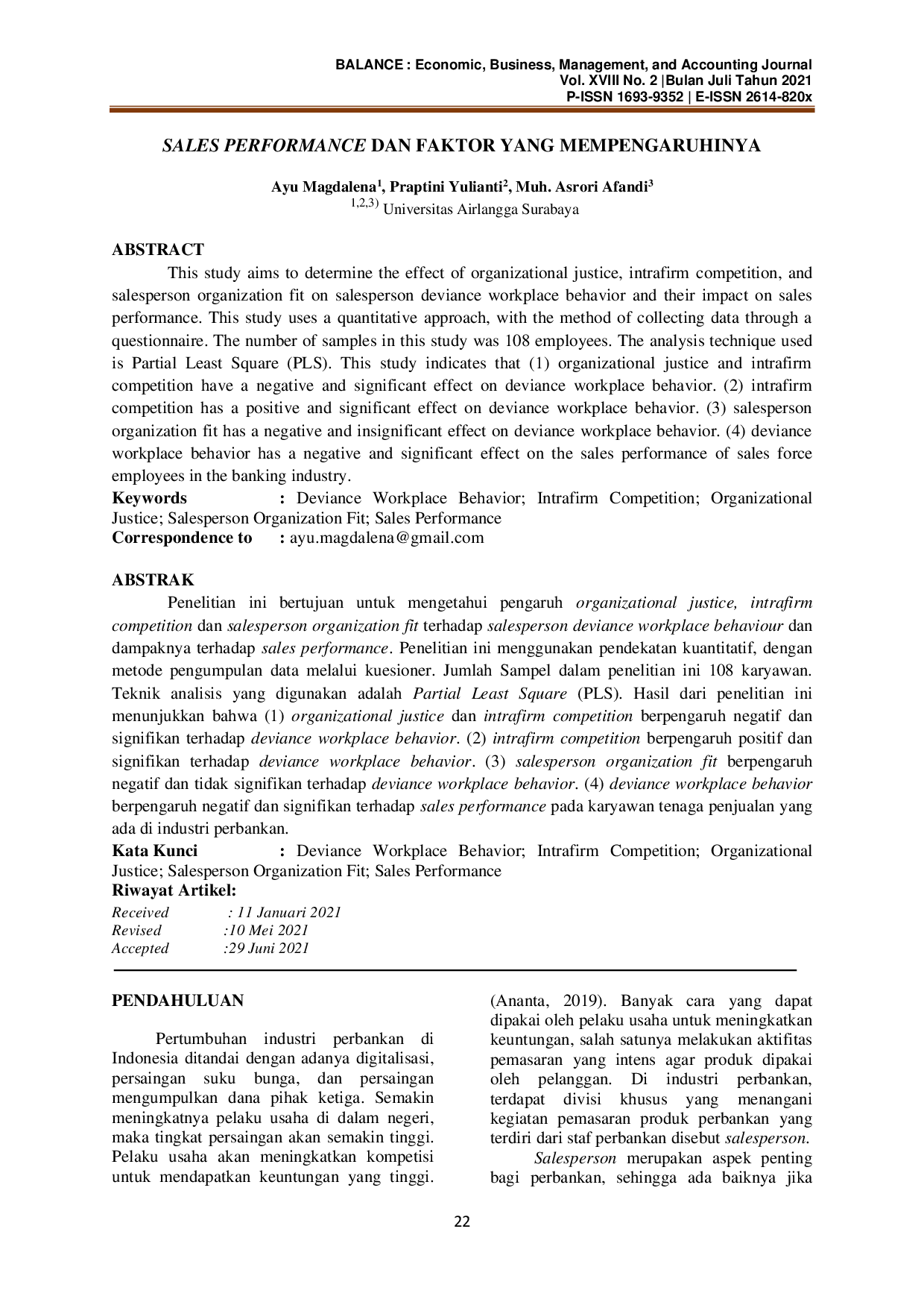 BALANCE: Economic, Business, Management and Accounting JournalBALANCE: Economic, Business, Management and Accounting JournalPenelitian ini bertujuan untuk mengetahui pengaruh organizational justice, intrafirm competition dan salesperson organization fit terhadap salesperson deviance workplace behaviour dan dampaknya terhadap sales performance. Penelitian ini menggunakan pendekatan kuantitatif, dengan metode pengumpulan data melalui kuesioner. Jumlah sampel dalam penelitian ini 108 karyawan. Teknik analisis yang digunakan adalah Partial Least Square (PLS). Hasil dari penelitian ini menunjukkan bahwa (1) organizational justice dan intrafirm competition berpengaruh negatif dan signifikan terhadap deviance workplace behavior. (2) intrafirm competition berpengaruh positif dan signifikan terhadap deviance workplace behavior. (3) salesperson organization fit berpengaruh negatif dan tidak signifikan terhadap deviance workplace behavior. (4) deviance workplace behavior berpengaruh negatif dan signifikan terhadap sales performance pada karyawan tenaga penjualan yang ada di industri perbankan.