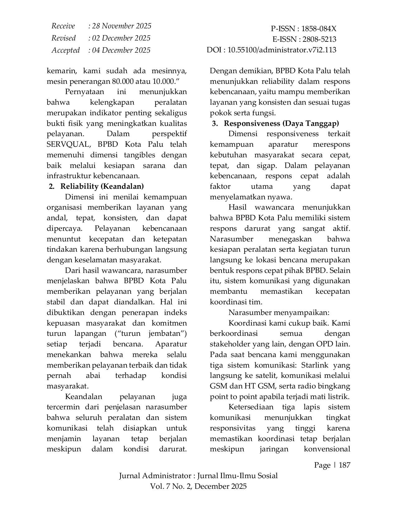 Jurnal ADMINISTRATORJurnal ADMINISTRATORPenelitian ini bertujuan untuk menganalisis profesionalisme aparatur dalam pelayanan publik kebencanaan pada Badan Penanggulangan Bencana Daerah (BPBD) Kota Palu dengan menggunakan pendekatan teori SERVQUAL yang dikembangkan oleh Parasuraman, Zeithaml, dan Berry. Kualitas pelayanan kebencanaan menjadi aspek krusial mengingat tingginya risiko bencana di Kota Palu seperti gempa bumi, tsunami, likuefaksi, banjir, dan cuaca ekstrem. Penelitian ini menggunakan metode kualitatif deskriptif dengan teknik pengumpulan data berupa wawancara mendalam, observasi, dan telaah dokumen. Analisis dilakukan dengan mengacu pada lima dimensi SERVQUAL: tangibles, reliability, responsiveness, assurance, dan empathy. Hasil penelitian menunjukkan bahwa dimensi tangibles terpenuhi dengan baik melalui kesiapan fasilitas dan peralatan kebencanaan seperti mesin dompeng untuk banjir besar, mesin penerangan berkapasitas tinggi, serta berbagai sarana operasional yang digunakan saat terjadi gempa bumi seperti tahun 2018. Aparatur menegaskan bahwa seluruh peralatan selalu disiapkan untuk memastikan kepuasan masyarakat dan mendukung penanganan cepat di lapangan. Pada dimensi reliability, BPBD menunjukkan keandalan melalui konsistensi pelayanan, penerapan indeks kepuasan masyarakat, serta komitmen “turun jembatan dalam setiap penanganan bencana. Keandalan layanan diperkuat oleh kesiapan sistem komunikasi darurat. Dimensi responsiveness terlihat dari tingginya daya tanggap BPBD dalam penanganan bencana, ditunjukkan oleh penggunaan tiga lapis sistem komunikasi yaitu Starlink berbasis satelit, GSM HT, dan radio bingkang point-to-point yang berfungsi ketika jaringan dan listrik mati total. Pada dimensi assurance, profesionalisme aparatur tercermin dalam kemampuan teknis, pemahaman terhadap SOP kebencanaan, koordinasi lintas OPD, dan penggunaan perangkat komunikasi modern yang memberikan rasa aman kepada masyarakat. Sementara itu, dimensi empathy terlihat dari kemampuan aparatur melakukan komunikasi humanis dan pendekatan psikologis, termasuk pendampingan trauma untuk anak-anak dan ibu-ibu selama masa darurat. Secara keseluruhan, profesionalisme aparatur BPBD Kota Palu berada pada kategori sangat baik berdasarkan lima dimensi SERVQUAL. Namun demikian, peningkatan berkelanjutan tetap diperlukan agar pelayanan kebencanaan semakin efektif, responsif, dan berorientasi pada keselamatan masyarakat.