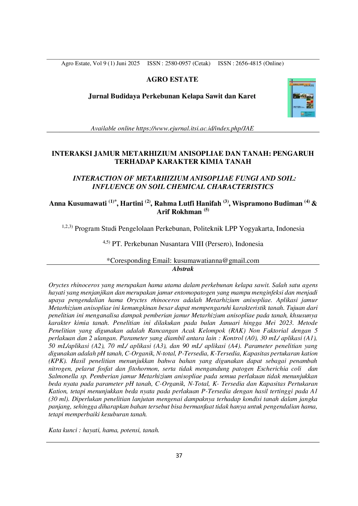 Jurnal Agro EstateJurnal Agro EstateOryctes rhinoceros merupakan hama utama pada perkebunan kelapa sawit. Jamur entomopatogen Metarhizium anisopliae menjanjikan sebagai agen hayati untuk mengendalikan hama tersebut dan berpotensi mempengaruhi karakteristik tanah. Penelitian ini bertujuan menganalisis dampak pemberian jamur Metarhizium anisopliae terhadap karakteristik kimia tanah, dilakukan dari Januari hingga Mei 2023 dengan Rancangan Acak Kelompok (RAK) Non Faktorial. Parameter yang diukur meliputi pH tanah, C-Organik, N-total, P-Tersedia, K-Tersedia, dan Kapasitas pertukaran kation (KPK). Hasil penelitian menunjukkan bahwa jamur ini dapat berfungsi sebagai penambah nitrogen, pelarut fosfat, dan penghasil fitohormon, serta tidak mengandung patogen Escherichia coli dan Salmonella sp. Pemberian jamur Metarhizium anisopliae tidak menunjukkan perbedaan nyata pada pH tanah, C-Organik, N-Total, K-Tersedia, dan KPK, tetapi menunjukkan perbedaan nyata pada P-Tersedia dengan hasil tertinggi pada dosis 30 ml. Penelitian lanjutan diperlukan untuk memahami dampak jangka panjang terhadap kondisi tanah, sehingga bahan ini dapat bermanfaat tidak hanya untuk pengendalian hama, tetapi juga memperbaiki kesuburan tanah.