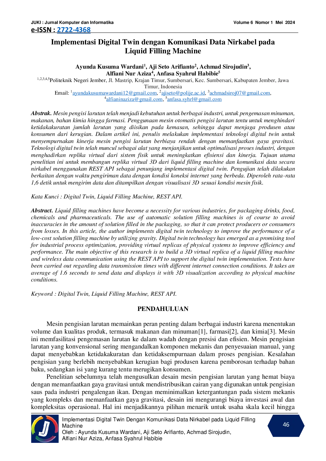 JUKI : Jurnal Komputer dan InformatikaJUKI : Jurnal Komputer dan InformatikaMesin pengisi larutan telah menjadi kebutuhan untuk berbagai industri, untuk pengemasan minuman, makanan, bahan kimia hingga farmasi. Penggunaan mesin otomatis pengisi larutan tentu untuk menghindari ketidakakuratan jumlah larutan yang diisikan pada kemasan, sehingga dapat menjaga produsen atau konsumen dari kerugian. Dalam artikel ini, penulis melakukan implementasi teknologi digital twin untuk menyempurnakan kinerja mesin pengisi larutan berbiaya rendah dengan memanfaatkan gaya gravitasi. Teknologi digital twin telah muncul sebagai alat yang menjanjikan untuk optimalisasi proses industri, dengan menghadirkan replika virtual dari sistem fisik untuk meningkatkan efisiensi dan kinerja. Tujuan utama penelitian ini untuk membangun replika virtual 3D dari liquid filling machine dan komunikasi data secara nirkabel menggunakan REST API sebagai penunjang implementasi digital twin. Pengujian telah dilakukan berkaitan dengan waktu pengiriman data dengan kondisi koneksi internet yang berbeda. Diperoleh rata-rata 1,6 detik untuk mengirim data dan ditampilkan dengan visualisasi 3D sesuai kondisi mesin fisik.