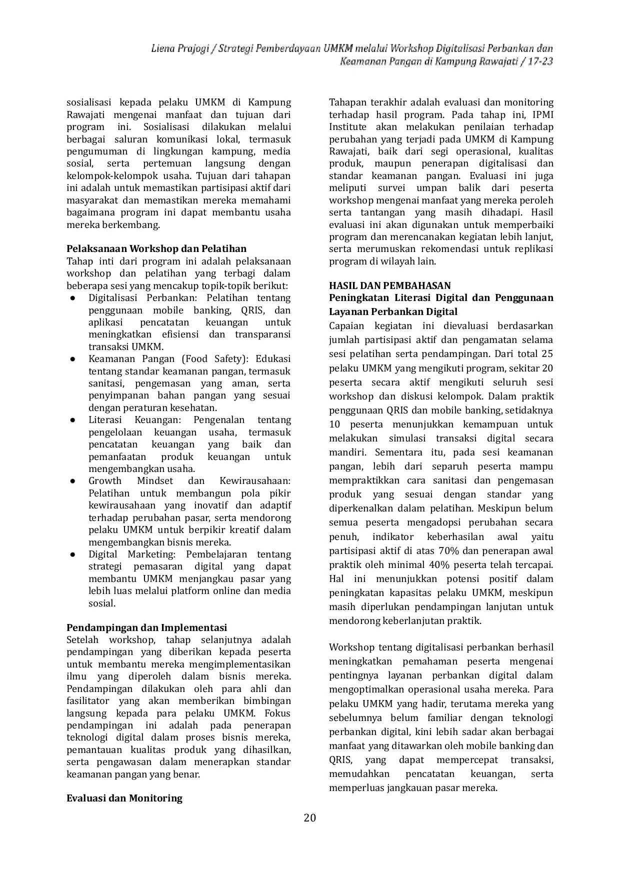Program pemberdayaan UMKM di Kampung Rawajati berhasil meningkatkan pemahaman tentang digitalisasi perbankan dan keamanan pangan, namun implementasinya masih terbatas.Diperlukan pendampingan berkelanjutan, akses teknologi yang lebih luas, serta sosialisasi berkelanjutan untuk memperkuat adopsi praktik baru.Evaluasi berkala diperlukan untuk memastikan keberlanjutan perubahan.