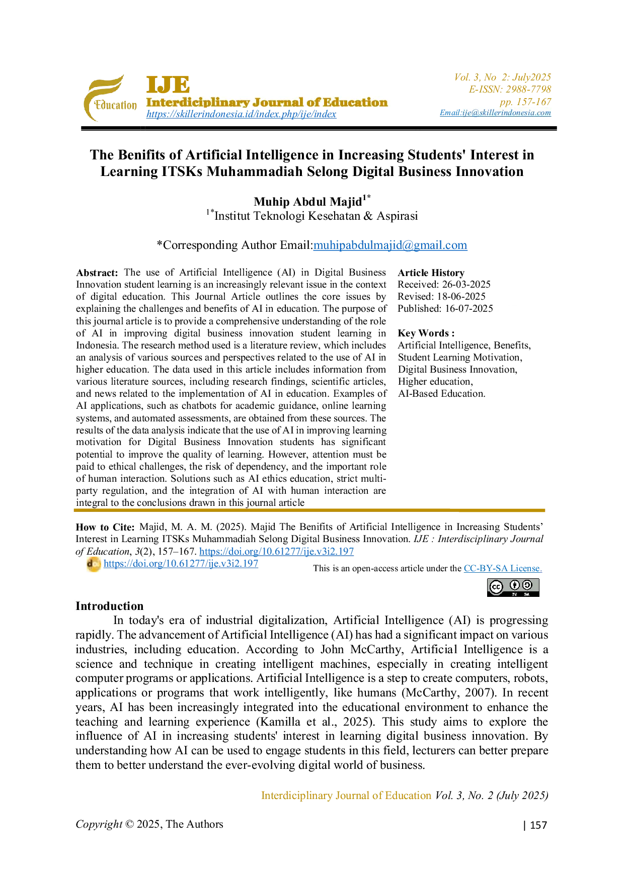 IJE : Interdisciplinary Journal of EducationIJE : Interdisciplinary Journal of EducationThe use of Artificial Intelligence (AI) in Digital Business Innovation student learning is an increasingly relevant issue in the context of digital education. This Journal Article outlines the core issues by explaining the challenges and benefits of AI in education. The purpose of this journal article is to provide a comprehensive understanding of the role of AI in improving digital business innovation student learning in Indonesia. The research method used is a literature review, which includes an analysis of various sources and perspectives related to the use of AI in higher education. The data used in this article includes information from various literature sources, including research findings, scientific articles, and news related to the implementation of AI in education. Examples of AI applications, such as chatbots for academic guidance, online learning systems, and automated assessments, are obtained from these sources. The results of the data analysis indicate that the use of AI in improving learning motivation for Digital Business Innovation students has significant potential to improve the quality of learning. However, attention must be paid to ethical challenges, the risk of dependency, and the important role of human interaction. Solutions such as AI ethics education, strict multi-party regulation, and the integration of AI with human interaction are integral to the conclusions drawn in this journal article.