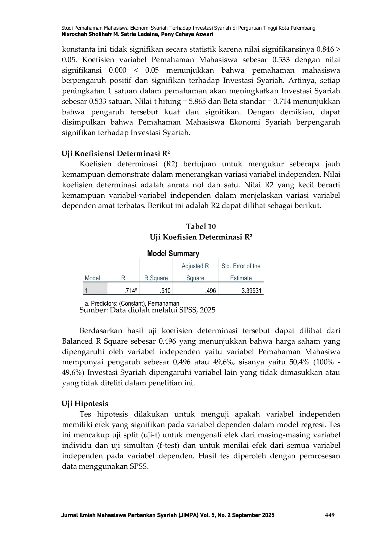 Jurnal Ilmiah Mahasiswa Perbankan Syariah (JIMPA)Jurnal Ilmiah Mahasiswa Perbankan Syariah (JIMPA)Penelitian ini dilakukan untuk mengkaji sejauh mana pemahaman mahasiswa Program Studi Ekonomi Syariah memengaruhi minat mereka dalam melakukan investasi berbasis syariah. Subjek penelitian terdiri dari mahasiswa dari tiga perguruan tinggi di Kota Palembang, yaitu UIN Raden Fatah, Universitas Muhammadiyah Palembang, dan Universitas Indo Global Mandiri. Pendekatan yang digunakan dalam penelitian ini adalah kuantitatif, dengan teknik pengumpulan data melalui kuesioner tertutup yang disebarkan secara online. Sebanyak 35 mahasiswa aktif menjadi responden dalam penelitian ini. Berdasarkan hasil uji validitas dan reliabilitas, seluruh item dalam instrumen dinyatakan layak digunakan. Analisis regresi linear berganda menunjukkan bahwa tingkat pemahaman mahasiswa berpengaruh secara positif dan signifikan terhadap minat berinvestasi syariah, dengan nilai koefisien regresi 0,533 dan signifikansi sebesar 0,000 (p < 0,05). Nilai adjusted R² sebesar 0,496 mengindikasikan bahwa hampir setengah dari variasi keputusan investasi syariah dapat dijelaskan oleh variabel pemahaman. Hasil penelitian ini mempertegas pentingnya literasi keuangan berbasis syariah dalam membentuk perilaku investasi yang sesuai dengan prinsip Islam. Oleh karena itu, diperlukan kerja sama antara institusi pendidikan tinggi dan lembaga keuangan syariah untuk meningkatkan pemahaman serta keterlibatan mahasiswa dalam aktivitas investasi syariah.