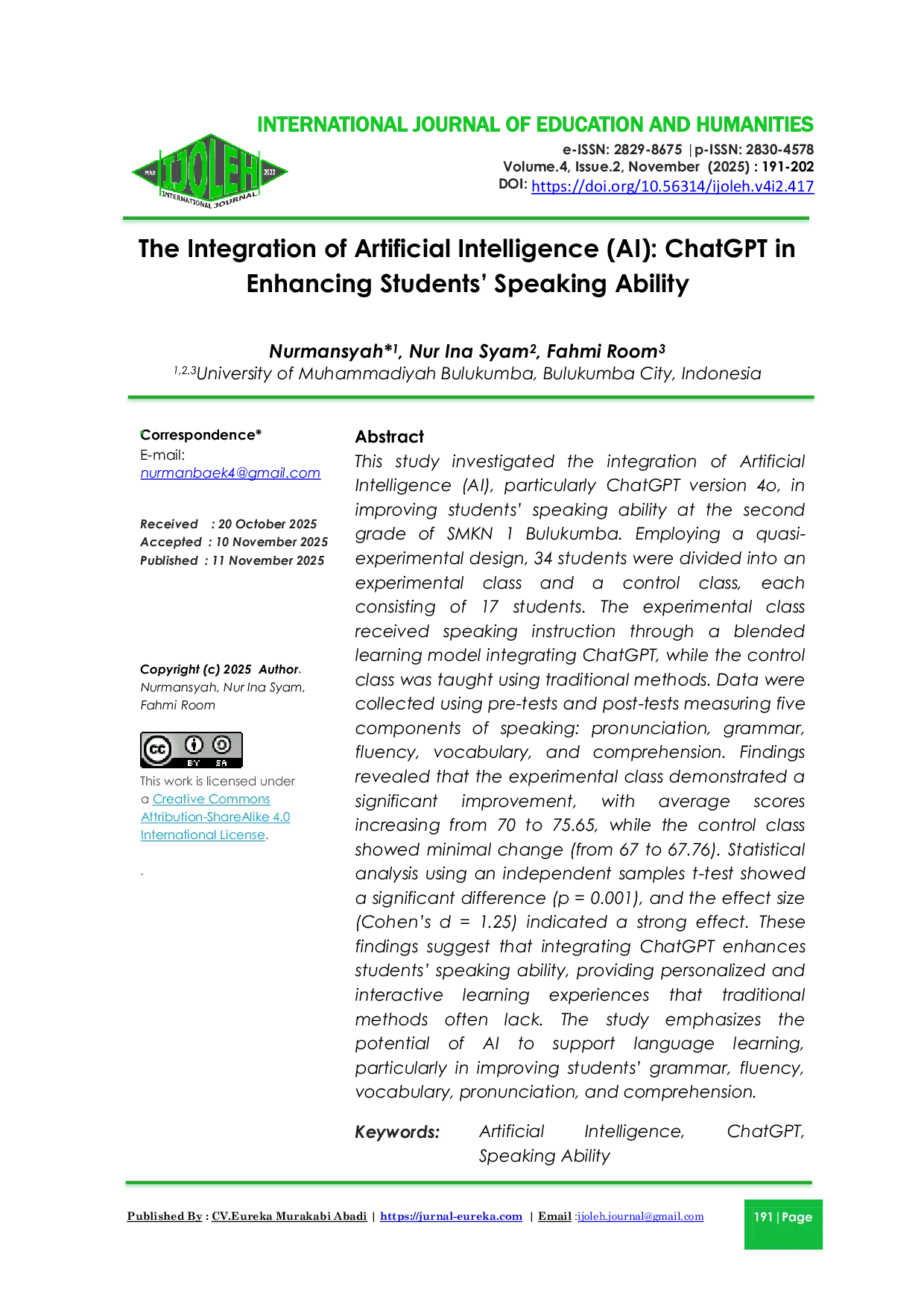 IJOLEH : International Journal of Education and HumanitiesIJOLEH : International Journal of Education and HumanitiesThis study investigated the integration of Artificial Intelligence (AI), particularly ChatGPT version 4o, in improving students speaking ability at the second grade of SMKN 1 Bulukumba. Employing a quasi-experimental design, 34 students were divided into an experimental class and a control class, each consisting of 17 students. The experimental class received speaking instruction through a blended learning model integrating ChatGPT, while the control class was taught using traditional methods. Data were collected using pre-tests and post-tests measuring five components of speaking: pronunciation, grammar, fluency, vocabulary, and comprehension. Findings revealed that the experimental class demonstrated a significant improvement, with average scores increasing from 70 to 75.65, while the control class showed minimal change (from 67 to 67.76). Statistical analysis using an independent samples t-test showed a significant difference (p = 0.001), and the effect size (Cohens d = 1.25) indicated a strong effect. These findings suggest that integrating ChatGPT enhances students speaking ability, providing personalized and interactive learning, support potential of AI particularly in improving students grammar, fluency, vocabulary, pronunciation, and comprehension.
