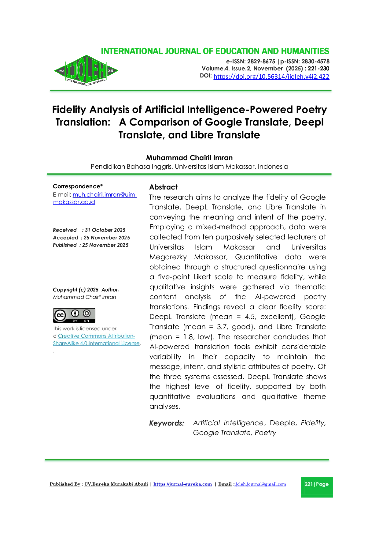IJOLEH : International Journal of Education and HumanitiesIJOLEH : International Journal of Education and HumanitiesThe research aims to analyze the fidelity of Google Translate, DeepL Translate, and Libre Translate in conveying the meaning and intent of the poetry. Employing a mixed-method approach, data were collected from ten purposively selected lecturers at Universitas Islam Makassar and Universitas Megarezky Makassar. Quantitative data were obtained through a structured questionnaire using a five-point Likert scale to measure fidelity, while qualitative insights were gathered via thematic content analysis of the AI-powered poetry translations. Findings reveal a clear fidelity score: DeepL Translate (mean = 4.5, excellent), Google Translate (mean = 3.7, good), and Libre Translate (mean = 1.8, low). The researcher concludes that AI-powered translation tools exhibit considerable variability in their capacity to maintain the message, intent, and stylistic attributes of poetry. Of the three systems assessed, DeepL Translate shows the highest level of fidelity, supported by both quantitative evaluations and qualitative theme analyses.