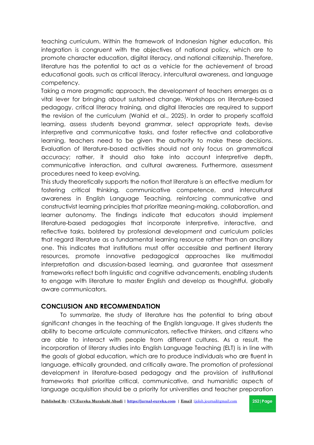 IJOLEH : International Journal of Education and HumanitiesIJOLEH : International Journal of Education and HumanitiesThis study examines the integration of literary studies into English Language Teaching (ELT) as a pedagogical approach to enhance learners critical thinking skills. This research used a qualitative descriptive methodology to investigate the role of literature—encompassing genres such as poetry, plays, short stories, and novels—as a conduit for linguistic enhancement, cultural awareness, and cognitive engagement. We obtained the data via classroom observations, documents, and semi-structured interviews with five EFL teachers and seven students from Indonesian universities. The results show that teaching through literature encourages learning, interpretation abilities, and interaction in discourse. The study finds that including literary texts in English (ELT) curricula encourages comprehensive language learning, combining linguistic development, intellectual development, and cultural awareness. There are several things to think about when designing a curriculum and training teachers. This study concludes that integrating literary studies into English Language Teaching fosters not only communicative competence but also critical and intercultural awareness, empowering learners to use English meaningfully and reflectively in diverse global contexts.