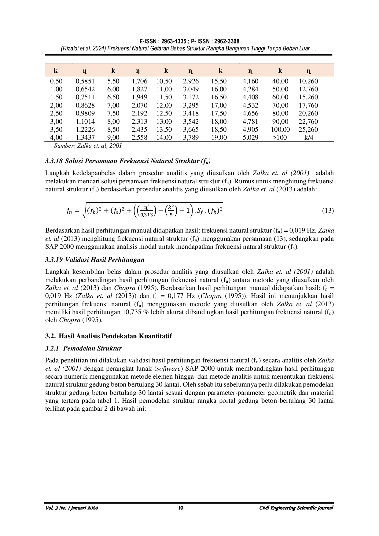 Civil Engineering Scientific JournalCivil Engineering Scientific JournalMetode perhitungan analitis sederhana, yang disebut metode Zalka, dikembangkan untuk menentukan frekuensi alami struktur rangka bangunan tinggi tanpa gaya luar. Model struktur rangka bangunan tinggi dapat diwakili oleh idealisasi struktur balok kantilever dengan kondisi perletakan ujung jepit bebas, yang menggambarkan karakteristik keseluruhan struktur rangka bangunan tinggi. Dokumen ini bertujuan untuk menyelidiki akurasi dan efisiensi metode Zalka dalam menentukan frekuensi alami struktur rangka bangunan beton 30 lantai tanpa gaya luar dan membandingkannya dengan output SAP 2000. Hasil penelitian ini akan memberikan pemahaman yang lebih baik tentang efektivitas dan ketersediaan metode Zalka dalam menentukan frekuensi alami struktur rangka bangunan tinggi tanpa gaya luar. Penelitian menemukan bahwa frekuensi alami dari struktur rangka bangunan beton 30 lantai menggunakan metode Zalka memiliki nilai kesalahan 4,884% dibandingkan dengan output SAP 2000, namun nilai tersebut berada dalam kisaran dapat diterima 7%, yang menunjukkan bahwa metode Zalka memiliki tingkat akurasi yang dapat diterima.