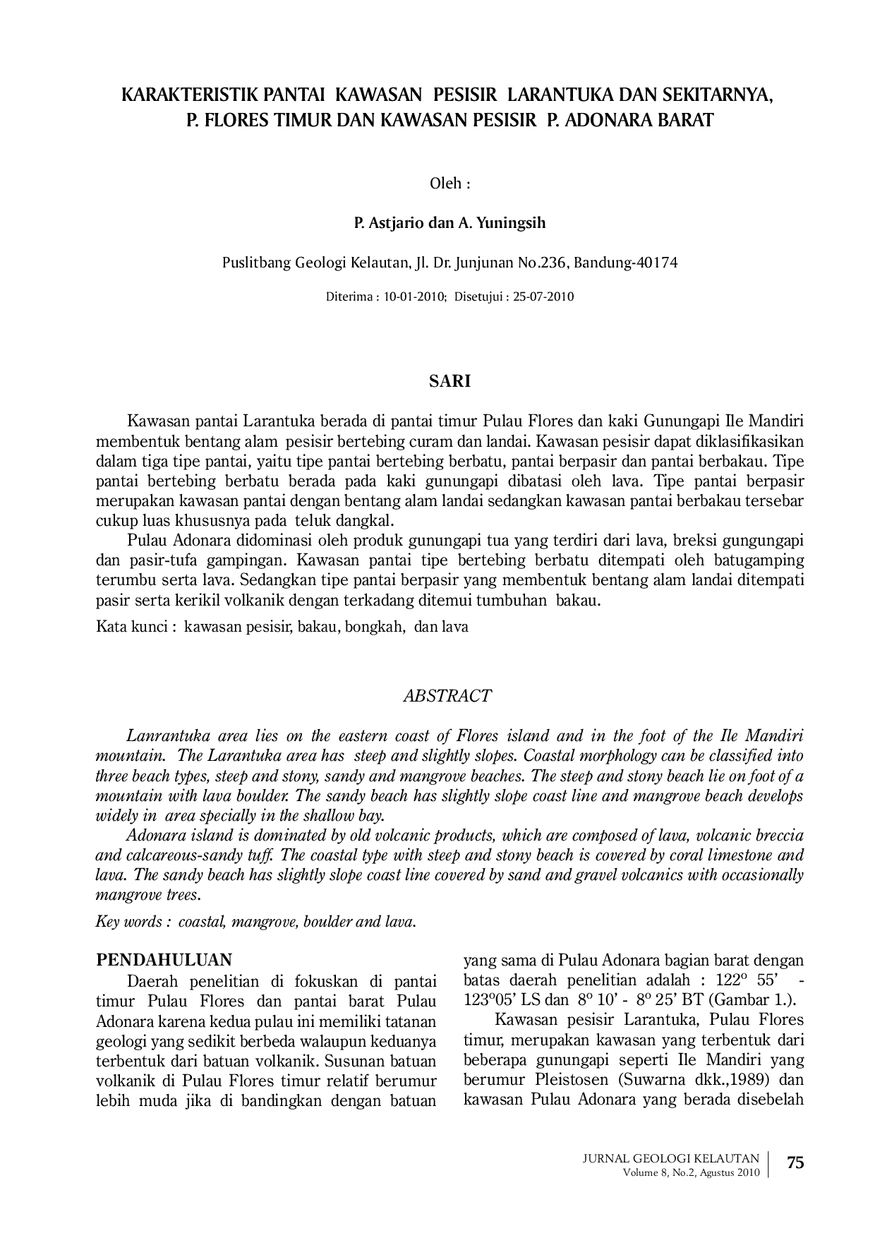 JURNAL GEOLOGI KELAUTANJURNAL GEOLOGI KELAUTANKawasan pantai Larantuka berada di pantai timur Pulau Flores dan kaki Gunungapi Ile Mandiri membentuk bentang alam pesisir bertebing curam dan landai. Kawasan pesisir dapat diklasifikasikan dalam tiga tipe pantai, yaitu tipe pantai bertebing berbatu, pantai berpasir dan pantai berbakau. Tipe pantai bertebing berbatu berada pada kaki gunungapi dibatasi oleh lava. Tipe pantai berpasir merupakan kawasan pantai dengan bentang alam landai sedangkan kawasan pantai berbakau tersebar cukup luas khususnya pada teluk dangkal. Pulau Adonara didominasi oleh produk gunungapi tua yang terdiri dari lava, breksi gungungapi dan pasir‑tufa gampingan. Kawasan pantai tipe bertebing berbatu ditempati oleh batugamping terumbu serta lava. Sedangkan tipe pantai berpasir yang membentuk bentang alam landai ditempati pasir serta kerikil volkanik dengan terkadang ditemui tumbuhan bakau.