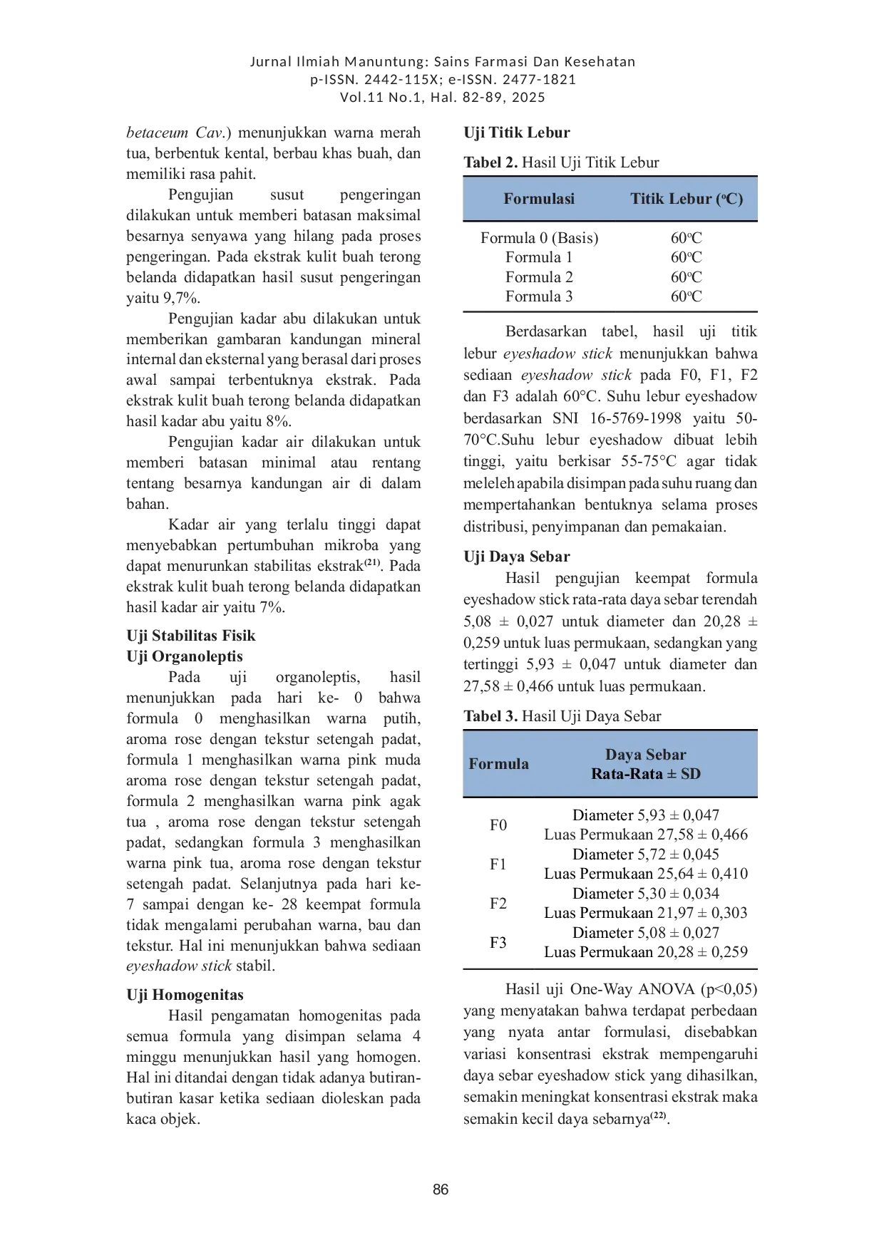 - FORMULASI DAN EVALUASI FISIK SEDIAAN EYESHADOW STICK DARI EKSTRAK KULIT BUAH TERONG BELANDA (Solanum... doi.org/10.51352/jim.v11i1.912FORMULASI DAN EVALUASI FISIK SEDIAAN EYESHADOW STICK DARI EKSTRAK KULIT BUAH TERONG BELANDA Solanum doi 10 51352 jim v11i1 912