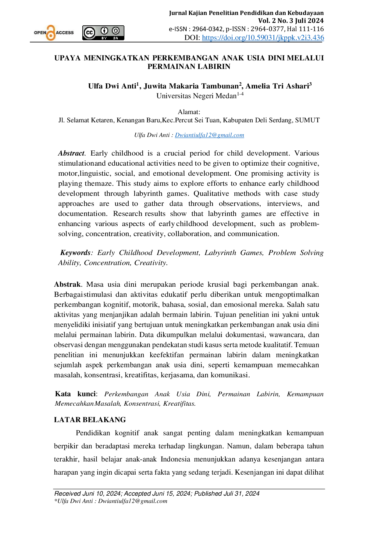 Jurnal Kajian Penelitian Pendidikan dan KebudayaanJurnal Kajian Penelitian Pendidikan dan KebudayaanMasa usia dini merupakan periode krusial bagi perkembangan anak. Berbagai stimulasi dan aktivitas edukatif perlu diberikan untuk mengoptimalkan perkembangan kognitif, motorik, bahasa, sosial, dan emosional mereka. Salah satu aktivitas yang menjanjikan adalah bermain labirin. Tujuan penelitian ini yakni untuk menyelidiki inisiatif yang bertujuan untuk meningkatkan perkembangan anak usia dini melalui permainan labirin. Data dikumpulkan melalui dokumentasi, wawancara, dan observasi dengan menggunakan pendekatan studi kasus serta metode kualitatif. Temuan penelitian ini menunjukkan keefektifan permainan labirin dalam meningkatkan sejumlah aspek perkembangan anak usia dini, seperti kemampuan memecahkan masalah, konsentrasi, kreatifitas, kerjasama, dan komunikasi.