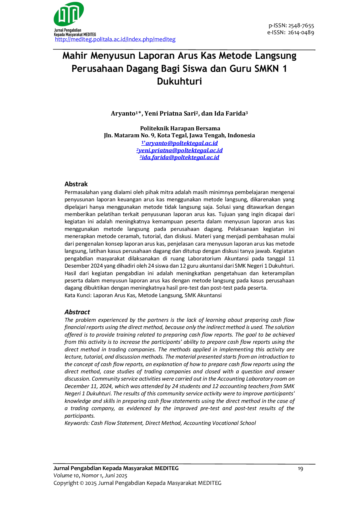 Jurnal Pengabdian Kepada Masyarakat (MEDITEG)Jurnal Pengabdian Kepada Masyarakat (MEDITEG)Permasalahan yang dialami oleh pihak mitra adalah masih minimnya pembelajaran mengenai penyusunan laporan keuangan arus kas menggunakan metode langsung, dikarenakan yang dipelajari hanya menggunakan metode tidak langsung saja. Solusi yang ditawarkan dengan memberikan pelatihan terkait penyusunan laporan arus kas. Tujuan yang ingin dicapai dari kegiatan ini adalah meningkatnya kemampuan peserta dalam menyusun laporan arus kas ini menggunakan metode menerapkan metode ceramah, tutorial, dan diskusi. Materi yang menjadi pembahasan mulai dari pengenalan konsep laporan arus kas, penjelasan cara menyusun laporan arus kas metode langsung, latihan kasus perusahaan dagang dan ditutup dengan diskusi tanya jawab. Kegiatan pengabdian masyarakat dilaksanakan di ruang Laboratorium Akuntansi pada tanggal 11 Desember 2024 yang dihadiri oleh 24 siswa dan 12 guru akuntansi dari SMK Negeri 1 Dukuhturi. Hasil dari kegiatan pengabdian ini adalah meningkatkan pengetahuan dan keterampilan peserta dalam menyusun laporan arus kas dengan metode langsung pada kasus perusahaan dagang dibuktikan dengan meningkatnya hasil pre-test dan post-test pada peserta.