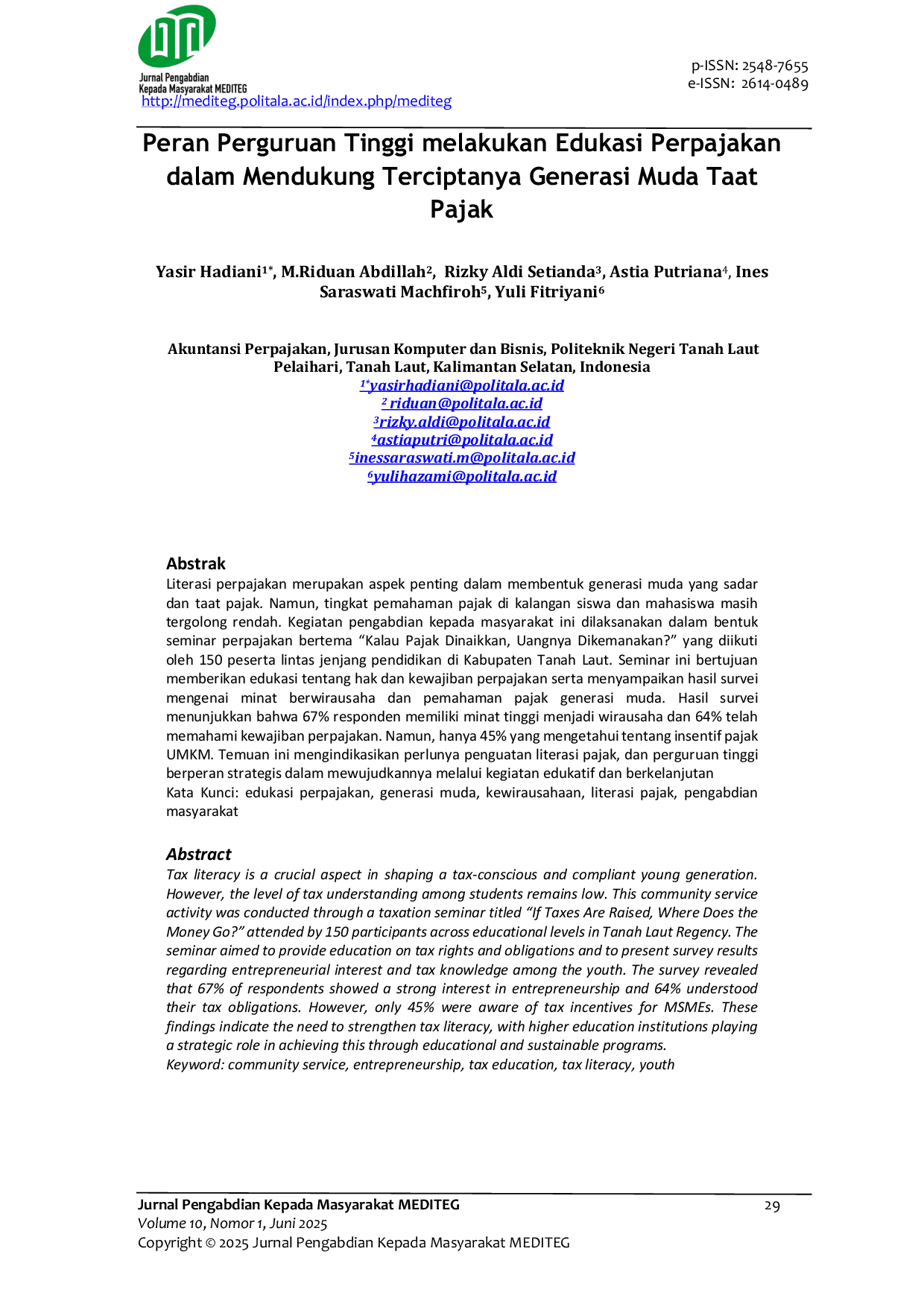 Jurnal Pengabdian Kepada Masyarakat (MEDITEG)Jurnal Pengabdian Kepada Masyarakat (MEDITEG)Literasi perpajakan merupakan aspek penting dalam membentuk generasi muda yang sadar dan taat pajak. Namun, tingkat pemahaman pajak di kalangan siswa dan mahasiswa masih tergolong rendah. Kegiatan pengabdian kepada masyarakat ini dilaksanakan dalam bentuk seminar perpajakan bertema “Kalau Pajak Dinaikkan, Uangnya Dikemanakan? yang diikuti oleh 150 peserta lintas jenjang pendidikan di Kabupaten Tanah Laut. Seminar ini bertujuan memberikan edukasi tentang hak dan kewajiban perpajakan serta menyampaikan hasil survei mengenai minat berwirausaha dan pemahaman pajak generasi muda. Hasil survei menunjukkan bahwa 67% responden memiliki minat tinggi menjadi wirausaha dan 64% telah memahami kewajiban perpajakan. Namun, hanya 45% yang mengetahui tentang insentif pajak UMKM. Temuan ini mengindikasikan perlunya penguatan literasi pajak, dan perguruan tinggi berperan strategis dalam mewujudkannya melalui kegiatan edukatif dan berkelanjutan.
