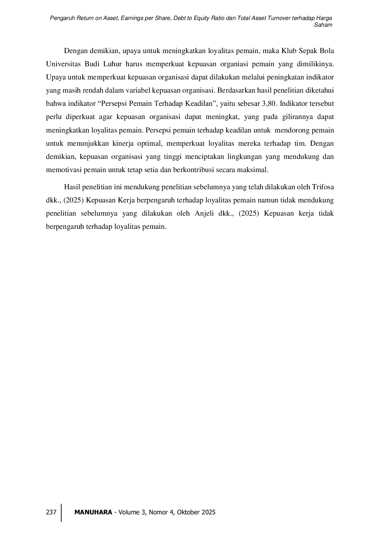 Jurnal Manuhara : Pusat Penelitian Ilmu Manajemen dan BisnisJurnal Manuhara : Pusat Penelitian Ilmu Manajemen dan BisnisPenelitian ini bertujuan untuk mengetahui secara lebih mendalam pengaruh Motivasi (X1), Lingkungan Organisasi (X2), dan Kepuasan Organisasi (X3) terhadap Loyalitas Pemain (Y) pada mahasiswa yang tergabung dalam Klub Sepak Bola Universitas Budi Luhur. Penelitian ini berangkat dari fenomena bahwa loyalitas anggota klub olahraga perguruan tinggi sering kali dipengaruhi oleh faktor psikologis dan lingkungan yang mendukung. Penelitian ini menggunakan pendekatan kuantitatif dengan teknik non probability sampling melalui metode jenuh, sehingga seluruh populasi yang berjumlah 45 pemain dijadikan sampel penelitian. Instrumen pengumpulan data berupa kuesioner terstruktur yang telah diuji validitas dan reliabilitasnya. Analisis data dilakukan menggunakan regresi linier berganda yang dibantu oleh program SPSS versi 25 serta Microsoft Excel 2016 untuk memperkuat perhitungan statistik. Hasil penelitian menunjukkan bahwa Motivasi (X1) berpengaruh positif dan signifikan terhadap Loyalitas Pemain (Y), yang berarti semakin tinggi motivasi yang dimiliki pemain, semakin tinggi pula loyalitasnya terhadap klub. Lingkungan Organisasi (X2) juga berpengaruh positif dan signifikan terhadap Loyalitas Pemain (Y), menunjukkan pentingnya kondisi organisasi yang mendukung dalam mempertahankan anggota. Demikian pula Kepuasan Organisasi (X3) ditemukan berpengaruh positif dan signifikan terhadap Loyalitas Pemain (Y), menegaskan bahwa kepuasan yang dirasakan anggota berkontribusi langsung pada loyalitas. Temuan ini menyoroti pentingnya pengelolaan motivasi, lingkungan organisasi, dan kepuasan anggota sebagai strategi untuk meningkatkan loyalitas pemain pada klub olahraga mahasiswa.