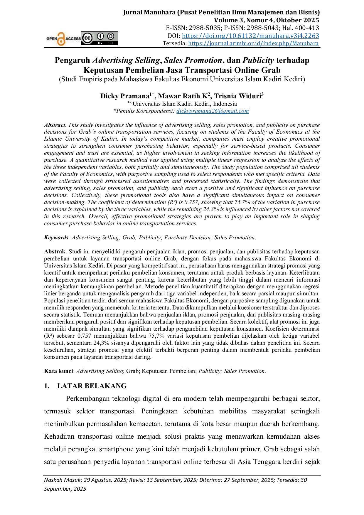 Jurnal Manuhara : Pusat Penelitian Ilmu Manajemen dan BisnisJurnal Manuhara : Pusat Penelitian Ilmu Manajemen dan BisnisStudi ini menyelidiki pengaruh penjualan iklan, promosi penjualan, dan publisitas terhadap keputusan pembelian untuk layanan transportasi online Grab, dengan fokus pada mahasiswa Fakultas Ekonomi di Universitas Islam Kediri. Di pasar yang kompetitif saat ini, perusahaan harus menggunakan strategi promosi yang kreatif untuk memperkuat perilaku pembelian konsumen, terutama untuk produk berbasis layanan. Keterlibatan dan kepercayaan konsumen sangat penting, karena keterlibatan yang lebih tinggi dalam mencari informasi meningkatkan kemungkinan pembelian. Metode penelitian kuantitatif diterapkan dengan menggunakan regresi linier berganda untuk menganalisis pengaruh dari tiga variabel independen, baik secara parsial maupun simultan. Temuan menunjukkan bahwa penjualan iklan, promosi penjualan, dan publisitas masing-masing memberikan pengaruh positif dan signifikan terhadap keputusan pembelian. Secara kolektif, alat promosi ini juga memiliki dampak simultan yang signifikan terhadap pengambilan keputusan konsumen. Koefisien determinasi (R²) sebesar 0,757 menunjukkan bahwa 75,7% variasi keputusan pembelian dijelaskan oleh ketiga variabel tersebut, sementara 24,3% sisanya dipengaruhi oleh faktor lain yang tidak dibahas dalam penelitian ini. Secara keseluruhan, strategi promosi yang efektif terbukti berperan penting dalam membentuk perilaku pembelian konsumen pada layanan transportasi daring.