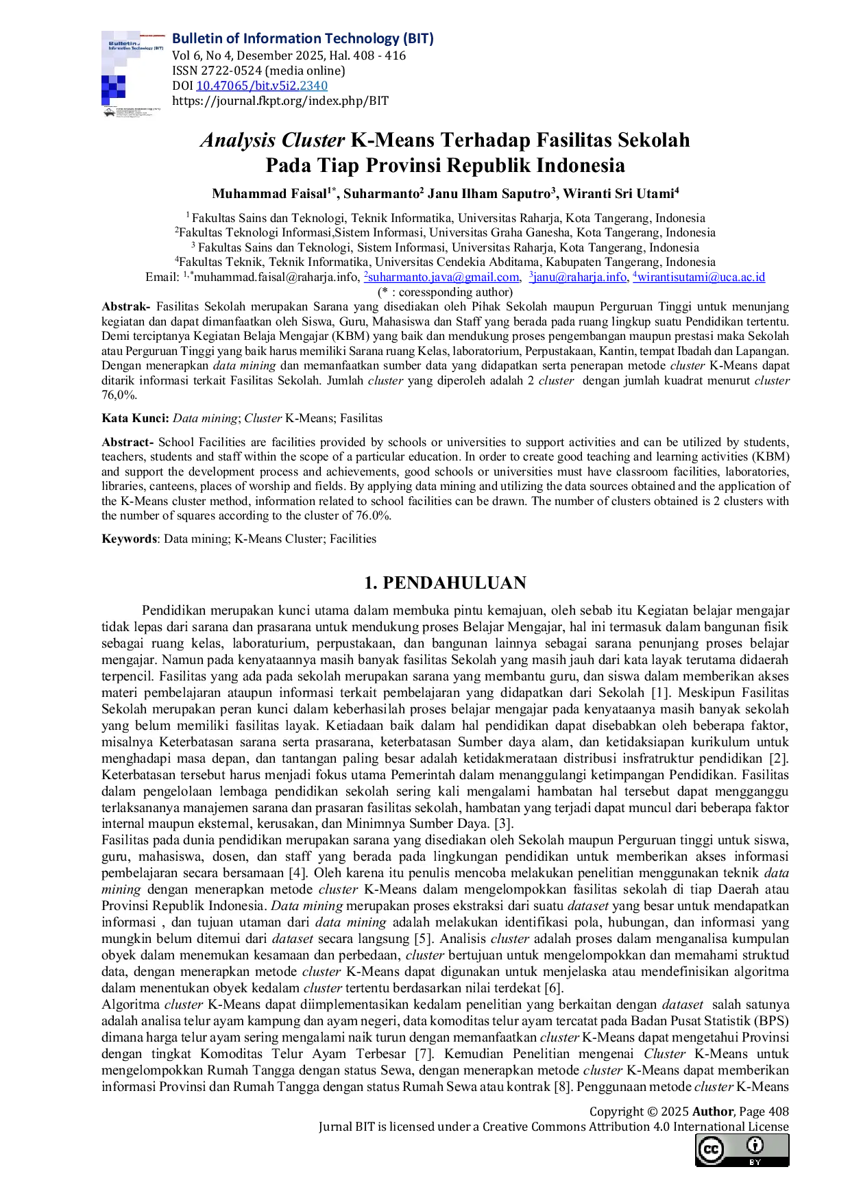 Bulletin of Information Technology (BIT)Bulletin of Information Technology (BIT)Fasilitas Sekolah merupakan Sarana yang disediakan oleh Pihak Sekolah maupun Perguruan Tinggi untuk menunjang kegiatan dan dapat dimanfaatkan oleh Siswa, Guru, Mahasiswa dan Staff yang berada pada ruang lingkup suatu Pendidikan tertentu. Demi terciptanya Kegiatan Belajar Mengajar (KBM) yang baik dan mendukung proses pengembangan maupun prestasi maka Sekolah atau Perguruan Tinggi yang baik harus memiliki Sarana ruang Kelas, laboratorium, Perpustakaan, Kantin, tempat Ibadah dan Lapangan. Dengan menerapkan data mining dan memanfaatkan sumber data yang didapatkan serta penerapan metode cluster K-Means dapat ditarik informasi terkait Fasilitas Sekolah. Jumlah cluster yang diperoleh adalah 2 cluster dengan jumlah kuadrat menurut cluster 76,0%.