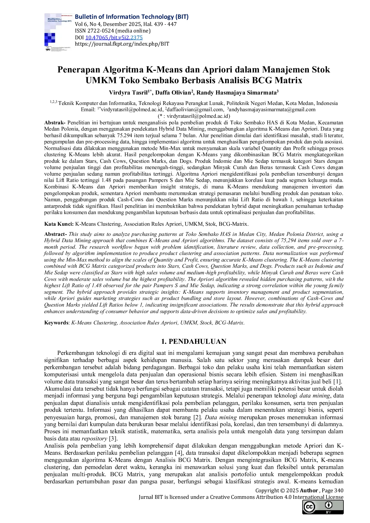 Bulletin of Information Technology (BIT)Bulletin of Information Technology (BIT)Penelitian ini bertujuan untuk menganalisis pola pembelian produk di Toko Sembako HAS di Kota Medan, Kecamatan Medan Polonia, dengan menggunakan pendekatan Hybrid Data Mining, menggabungkan algoritma K-Means dan Apriori. Data yang berhasil dikumpulkan sebanyak 75.294 item terjual selama 7 bulan. Alur penelitian dimulai dari identifikasi masalah, studi literatur, pengumpulan dan pre-processing data, hingga implementasi algoritma untuk menghasilkan pengelompokan produk dan pola asosiasi. Normalisasi data dilakukan menggunakan metode Min-Max untuk menyamakan skala variabel Quantity dan Profit sehingga proses clustering K-Means lebih akurat. Hasil pengelompokan dengan K-Means yang dikombinasikan BCG Matrix mengkategorikan produk ke dalam Stars, Cash Cows, Question Marks, dan Dogs. Produk Indomie dan Mie Sedap termasuk kategori Stars dengan volume penjualan tinggi dan profitabilitas menengah-tinggi, sedangkan Minyak Curah dan Beras termasuk Cash Cows dengan volume penjualan sedang namun profitabilitas tertinggi. Algoritma Apriori mengidentifikasi pola pembelian tersembunyi dengan nilai Lift Ratio tertinggi 1.48 pada pasangan Pampers S dan Mie Sedap, menunjukkan korelasi kuat pada segmen keluarga muda. Kombinasi K-Means dan Apriori memberikan insight strategis, di mana K-Means mendukung manajemen inventori dan pengelompokan produk, sementara Apriori membantu merumuskan strategi pemasaran melalui bundling produk dan penataan toko. Namun, penggabungan produk Cash-Cows dan Question Marks menunjukkan nilai Lift Ratio di bawah 1, sehingga keterkaitan antarproduk tidak signifikan. Hasil penelitian ini membuktikan bahwa pendekatan hybrid dapat meningkatkan pemahaman terhadap perilaku konsumen dan mendukung pengambilan keputusan berbasis data untuk optimalisasi penjualan dan profitabilitas.