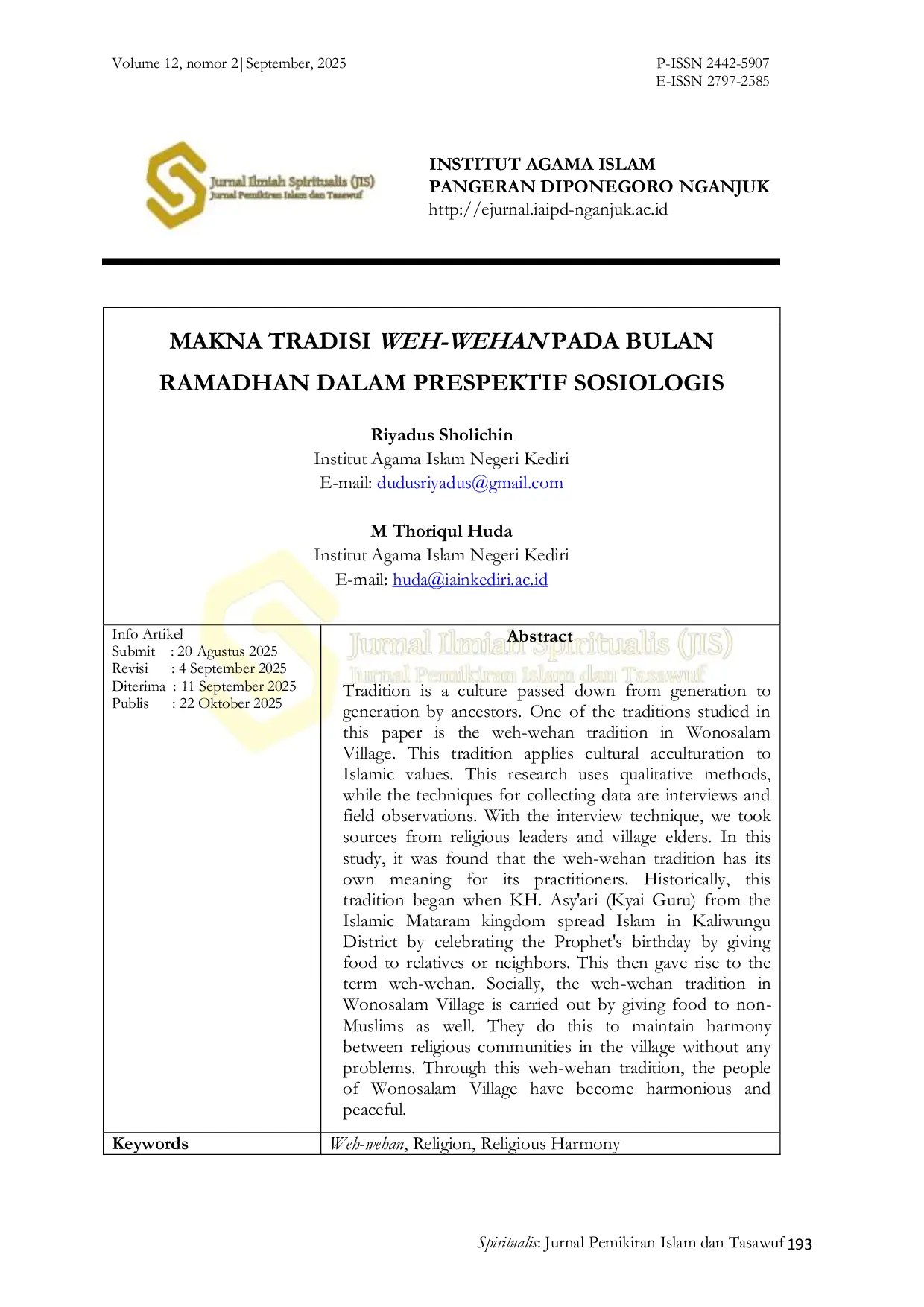 Jurnal Ilmiah Spiritualis: Jurnal Pemikiran Islam dan TasawufJurnal Ilmiah Spiritualis: Jurnal Pemikiran Islam dan TasawufTradisi merupakan budaya yang diturunkan dari generasi ke generasi oleh leluhur. Salah satu tradisi yang diteliti dalam artikel ini adalah tradisi weh-wehan di Desa Wonosalam. Tradisi ini menerapkan akulturasi budaya terhadap nilai-nilai Islam. Penelitian ini menggunakan metode kualitatif dengan teknik pengumpulan data berupa wawancara dan observasi lapangan. Hasil penelitian menunjukkan bahwa tradisi weh-wehan memiliki makna tersendiri bagi para pelakunya. Secara historis, tradisi ini bermula ketika KH. Asyari (Kyai Guru) dari kerajaan Islam Mataram menyebarkan agama Islam di Kaliwungu dengan merayakan hari kelahiran Nabi Muhammad SAW dengan memberikan makanan kepada kerabat atau tetangga, yang kemudian melahirkan istilah weh-wehan. Secara sosial, tradisi weh-wehan di Desa Wonosalam dilakukan dengan memberikan makanan kepada non-Muslim untuk menjaga harmoni antar umat beragama di desa tanpa adanya masalah. Melalui tradisi weh-wehan ini, masyarakat Desa Wonosalam menjadi harmonis dan damai.