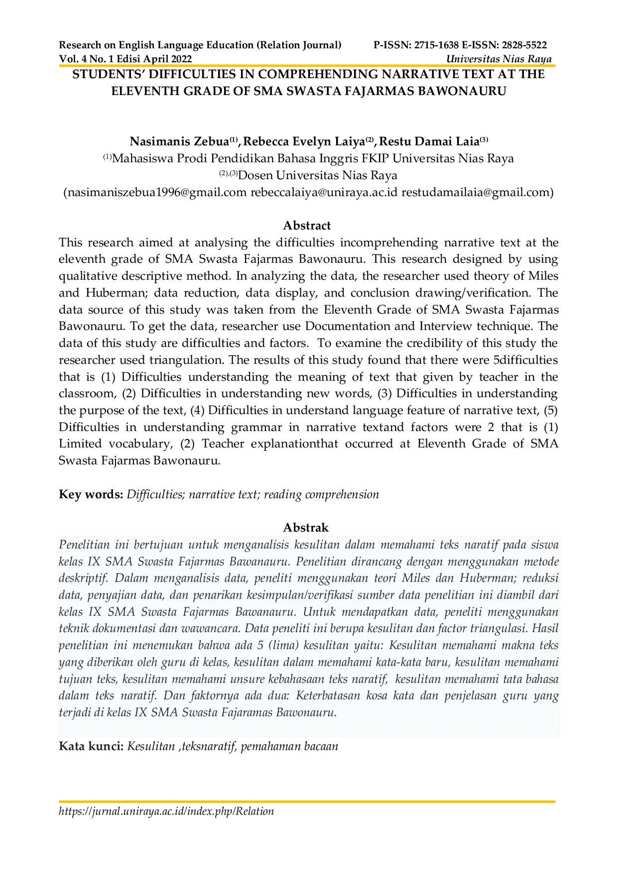 Research on English Language EducationResearch on English Language EducationThis research aimed at analysing the difficulties in comprehending narrative text at the eleventh grade of SMA Swasta Fajarmas Bawonauru. This research designed by using qualitative descriptive method. In analyzing the data, the researcher used theory of Miles and Huberman; data reduction, data display, and conclusion drawing/verification. The data source of this study was taken from the Eleventh Grade of SMA Swasta Fajarmas Bawonauru. To get the data, researcher use Documentation and Interview technique. The data of this study are difficulties and factors. To examine the credibility of this study the researcher used triangulation. The results of this study found that there were 5 difficulties that is (1) Difficulties understanding the meaning of text that given by teacher in the classroom, (2) Difficulties in understanding new words, (3) Difficulties in understanding the purpose of the text, (4) Difficulties in understand language feature of narrative text, (5) Difficulties in understanding grammar in narrative text and factors were 2 that is (1) Limited vocabulary, (2) Teacher explanation that occurred at Eleventh Grade of SMA Swasta Fajarmas Bawonauru.